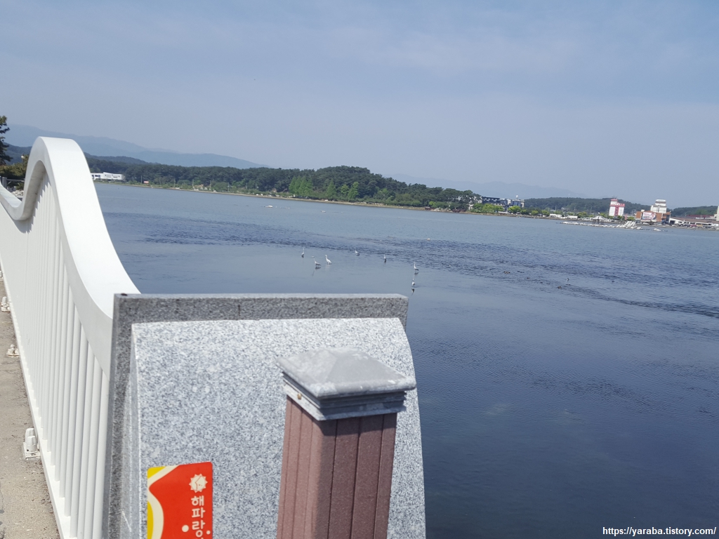 넓은 경포호를 오른쪽에 두고 길을 이어간다. 해파랑길 표식을 따라 걷지만, 시선은 호수에서 눈을 뗄 수 없는 길이다. 경포호와 경포천을 잇는 물길 위를 경호교로 지나면 경포 호수 광장을 만난다.