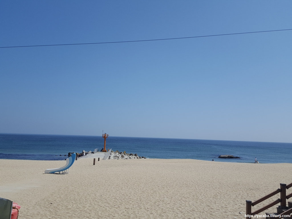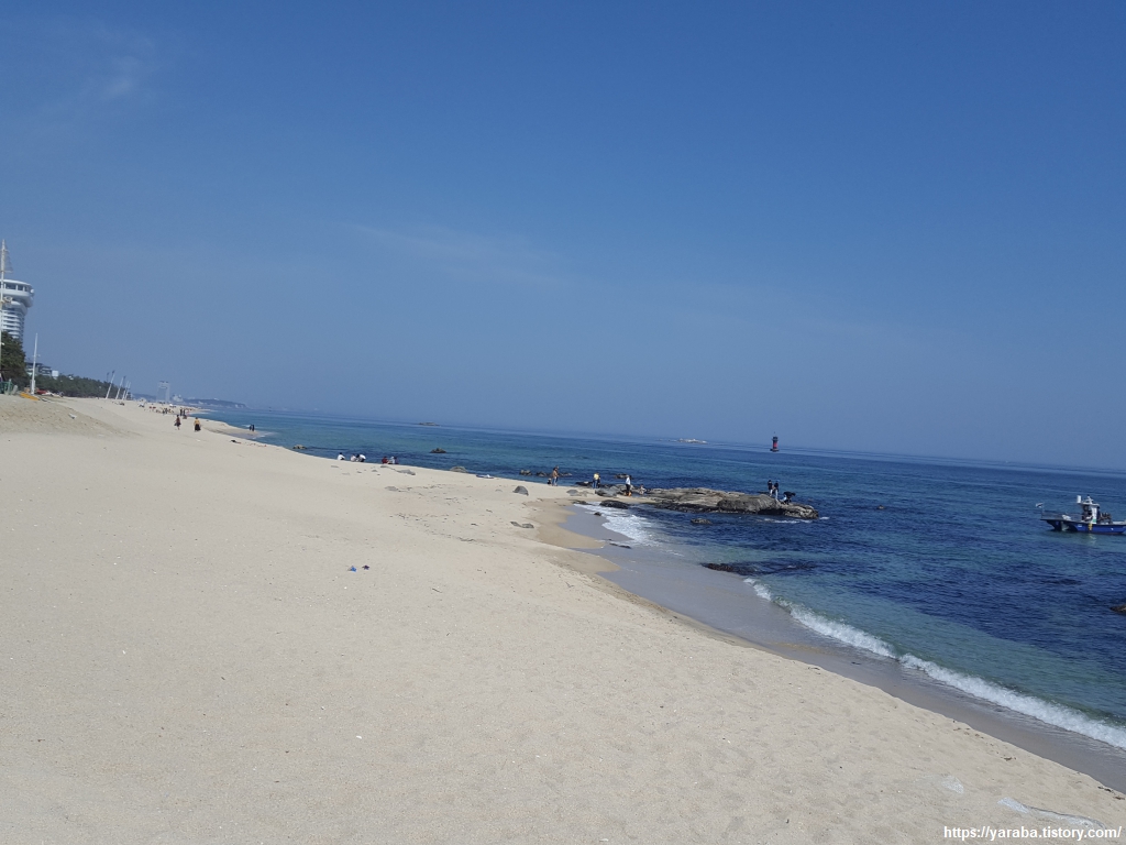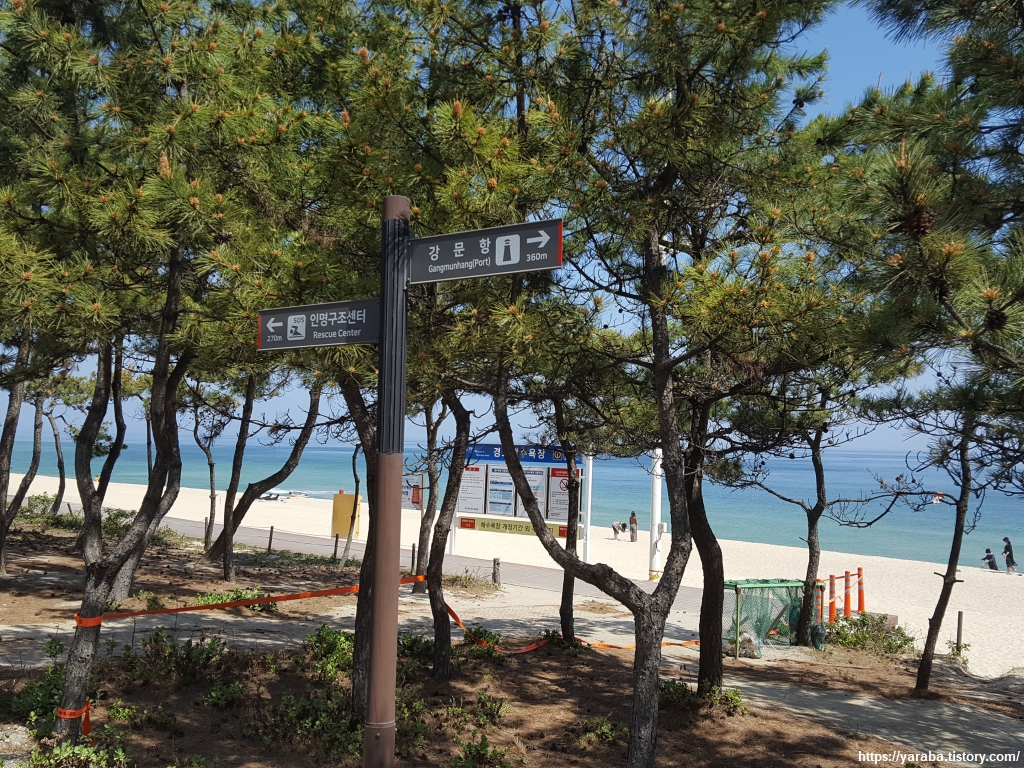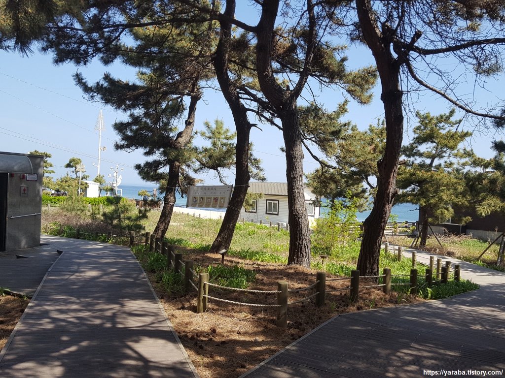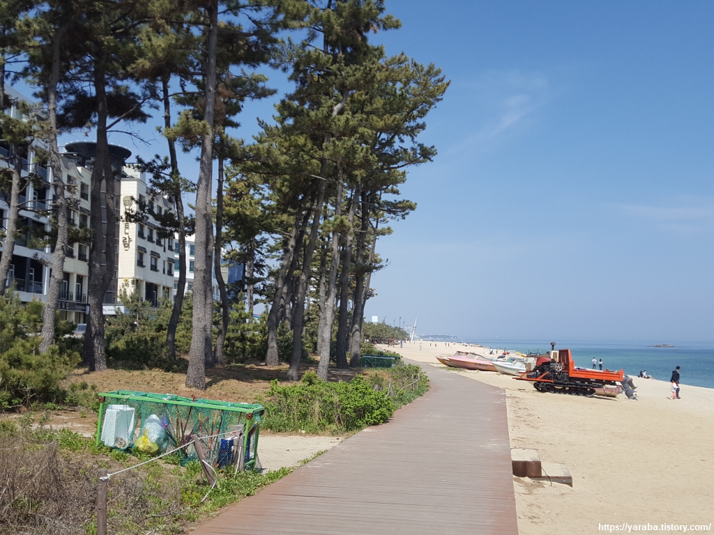 인기 있는 행락지답게 해변 곳곳으로 쓰레기통도 설치되어 있었다. 나무는 송정 해변의 솔숲보다는 많이 작지만 십여 년이 흐르면 송정 해변만큼 울창했으면 하는 바람이다. 올망졸망한 숙소들이 줄지어 있는 거리를 지난다.