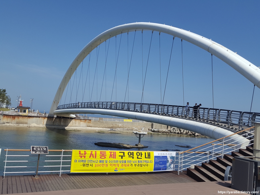 사람만 다닐 수 있는 강문 솟대 다리를 건너면 경포 해변에 이른다.