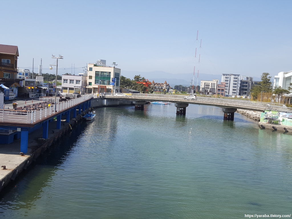 강문 솟대 다리에서 바라본 경포호 방면의 모습과 경포천이 바다와 만나는 지점의 모습이다. 다리 옆에는 솟대 모양의 가로등이 있는 작은 솟대 공원이 자리하고 있고 공원 아래로는 어선들이 정박할 수 있는 강문항이 있다. 사실 강릉에 여러 번 왔지만 경포호와 사람들이 북적이는 경포 앞바다만 조금 보고 지나갔지 경포 주변을 이렇게 조곤조곤 보는 것은 처음이다. 걷기 여행이니까 누릴 수 있는 것이 아닐까! 사실 경포호만 알지 경포천은 생각도 못했다. 호수가 생기려면 물줄기가 있을 것이고 경포호는 바로 경포천이 바다와 합작으로 만든 것이다. 강릉시 성산면에 있는 400여 미터의 멍어재에서 발원하여 강릉 시내를 거쳐 동해로 빠져나가는 경포천은 작은 하천이지만 하천 주위로 많은 사람들을 품고 있는 하천이다. 5만 명이 넘는 사람들이 살고 있다고 한다. 중간에 경포 생태 저류지, 오죽헌지, 경포 가시연 습지, 경포호를 차례로 거쳐서 동해로 빠져나간다.