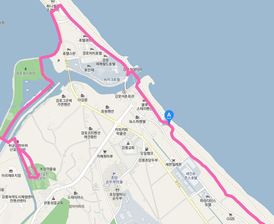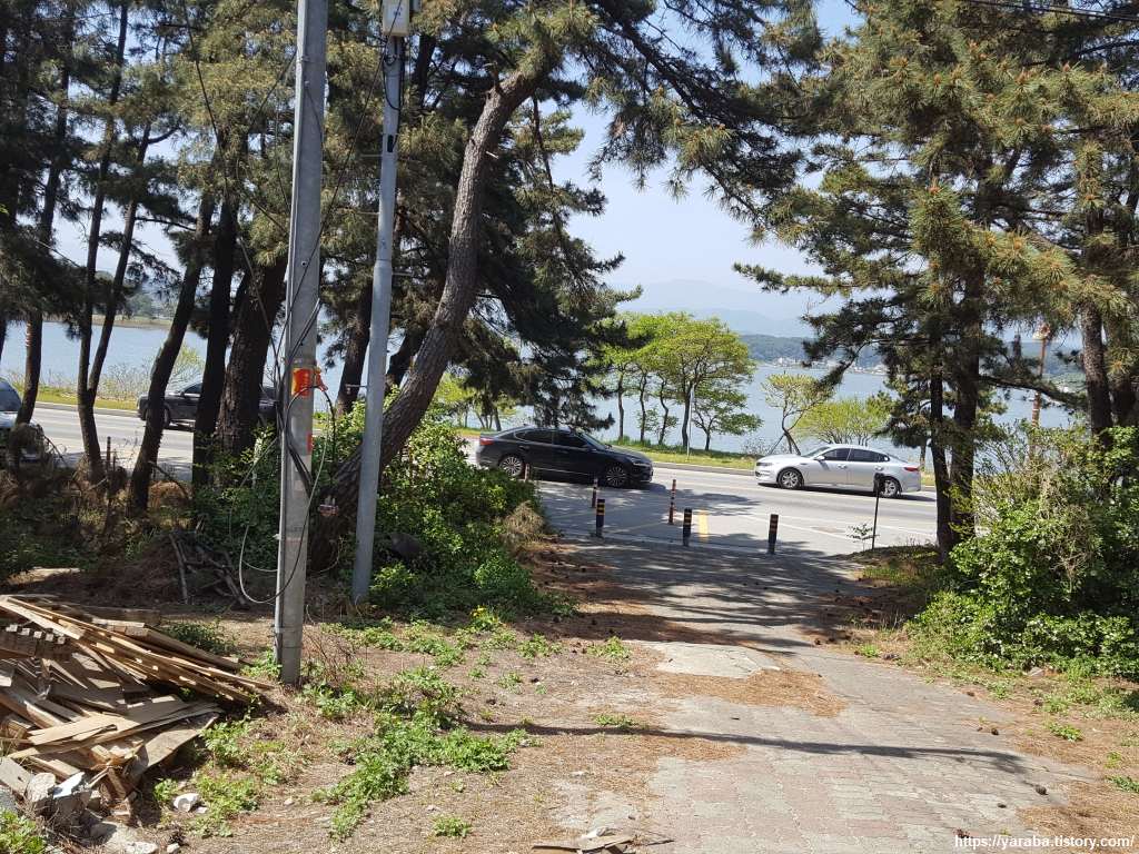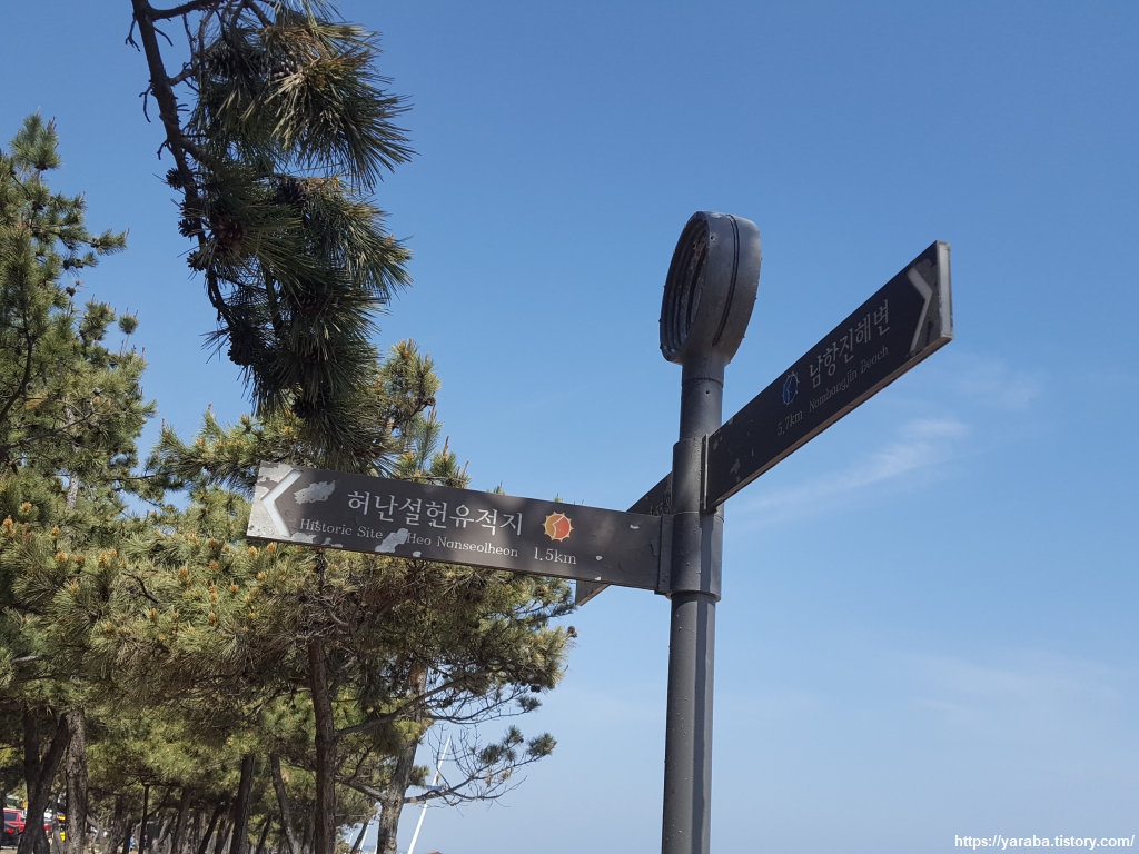 숙소와 상점이 줄지어 있는 거리를 지나 허난설헌 유적지 표지판을 보고 좌회전하여 경포호가 보이는 해안로 도로 방향으로 빠져나간다.