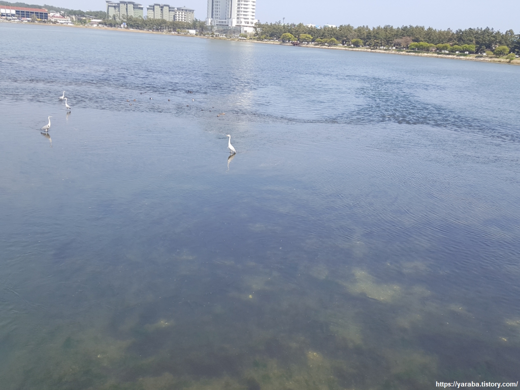경포호의 주인인 물새다. 나그네새인 노랑부리 저어새와 텃새인 흰 뺨 검둥 오리가 오가는 사람들을 개의치 않고 자신들 만의 시간을 갖고 있다.