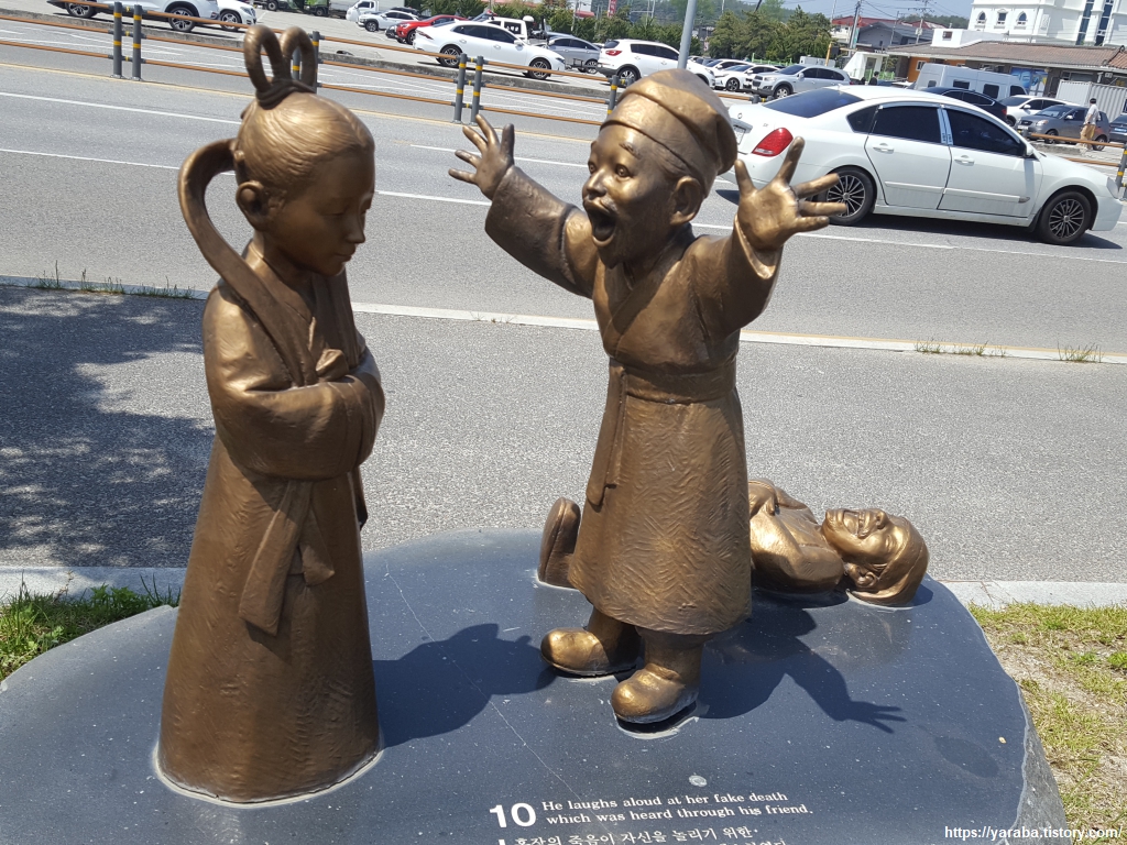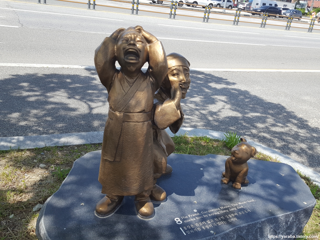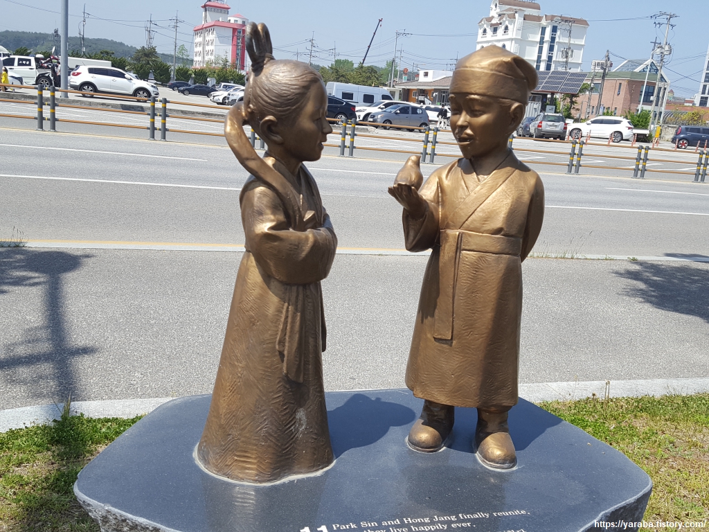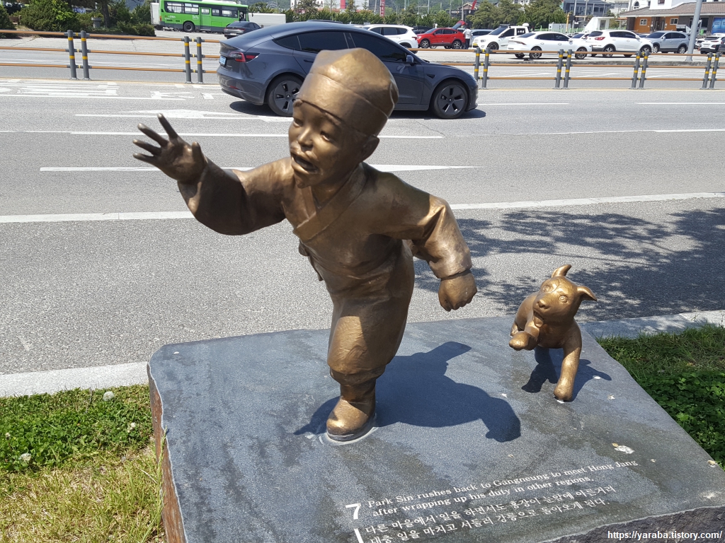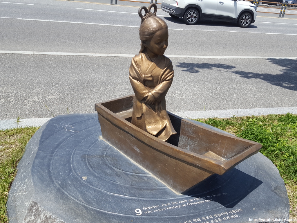 "5. 홍장과 박신은 강릉에 있는 동안 행복한 시간을 보내고 깊은 정도 나누게 된다." "6. 박신은 다른 마을의 순찰을 가야 하는 터라 어쩔 수 없이 강릉을 떠나야 했다" 갈라진 땅, 두 사람을 붙잡고 있는 사람으로 표현한 조각은 애절한 이별 순간을 제대로 표현했다. 안렴사였던 박신의 신분을 보면 예견된 수순이었을지도 모른다.
