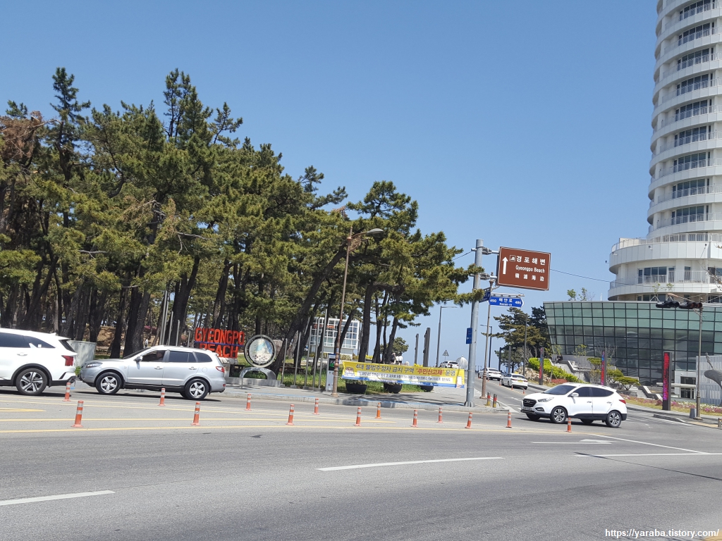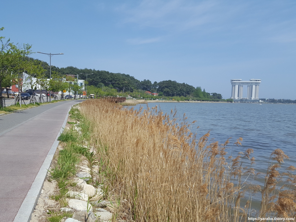경포대를 지나 해안을 향해서 길을 이어간다. 호숫가 풍경은 아름답지만 뙤약볕 아래서 그늘 하나 없는 길을 이어간다. 멀리 해변에 자리 잡은 대형 호텔은 경포 해변과 경포호의 경관을 모두 꿀꺽한 듯한 자리에 우뚝 서있다. 평창 동계 올림픽을 겨냥해서 세워졌다고 한다.