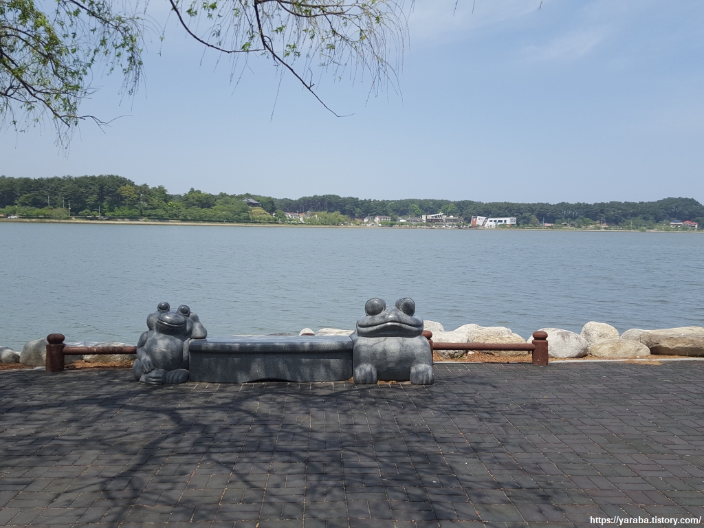 호수 건너편 언덕으로는 경포대가 서 있다. 왕눈이 개구리 두 마리가 제공하는 돌 벤치에 미소 지으며 길을 이어간다.