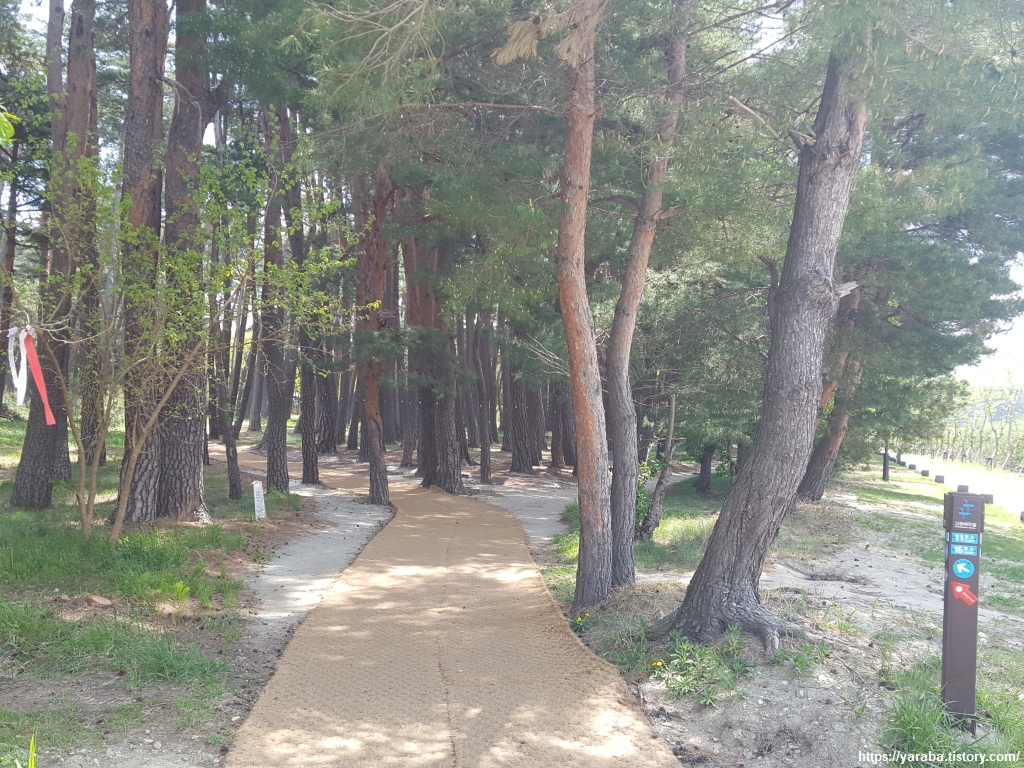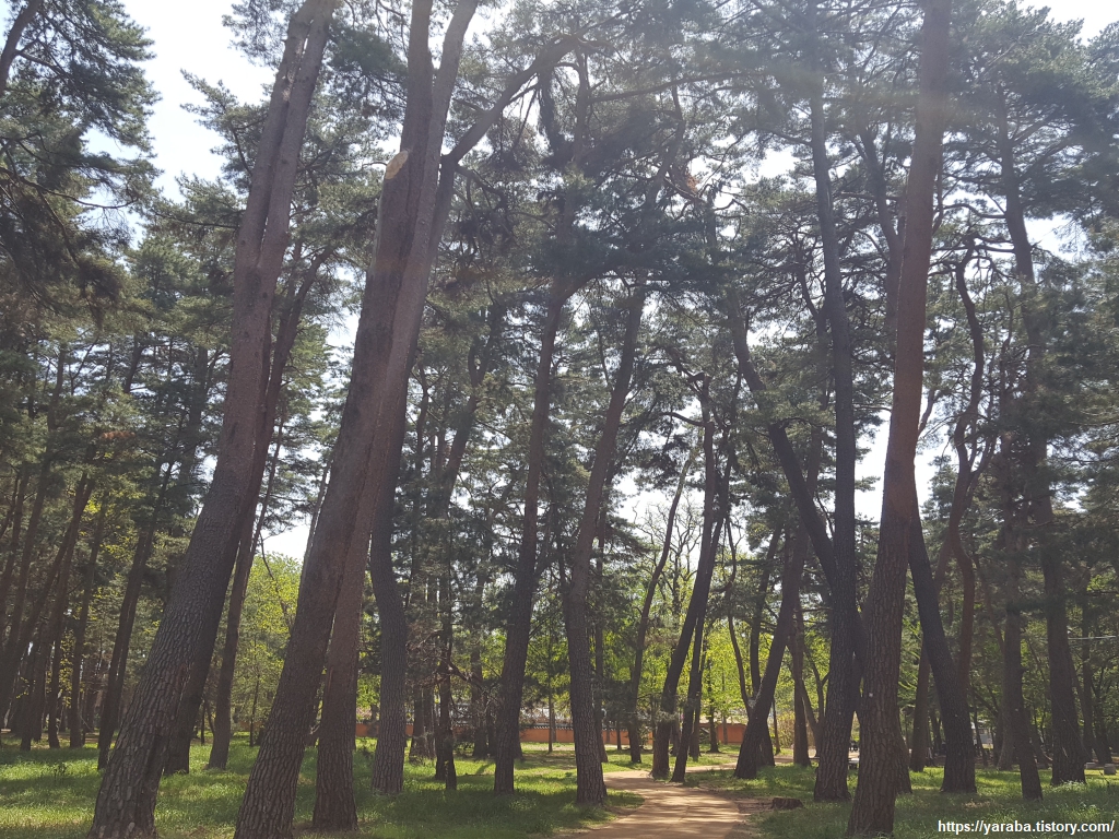 허균, 허난설헌 기념 공원 안으로 들어가는 길, 머리를 바싹 들어야 볼 수 있는 엄청난 높이의 소나무 숲이 만들어 내는 나무 그늘은 신비한 느낌마저 자아낸다. 해파랑길 39코스의 대부분을 함께 가는 강릉 바우길 5구간은 여기로 들어오지 않고 경포호 주변을 그대로 걷지만 대신 바우길 11구간과 16구간이 길을 함께한다. 그런데, 바우길 11구간은 이곳이 시작점이지만 16구간은 강릉 원주 대학교 홍보관에서 시작하여 이곳을 거쳐가는 것이므로 이제부터는 바우길 표지만 따라가면 엉뚱한 길로 갈 수 있다. 실제로 우리 부부도 바우길 표지를 따라가다가 살짝 길을 잃었었다. 이곳에서는 해파랑길 표지판만 따라가야 한다.