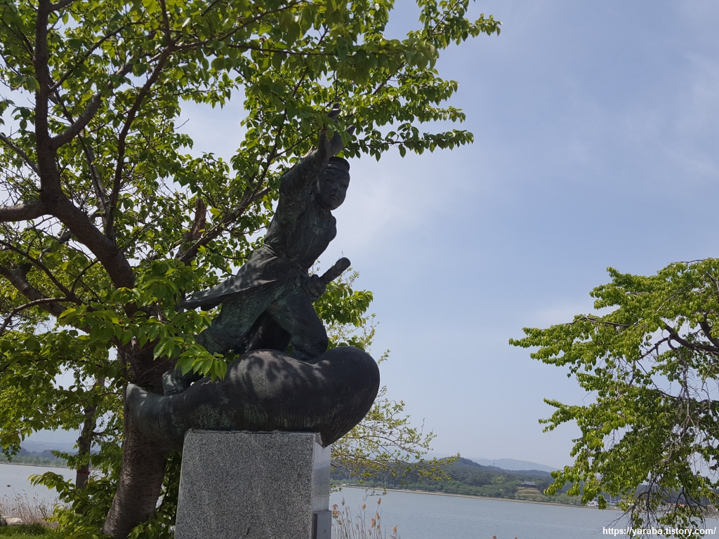 경포호 산책길은 조각 작품을 감상하며 걸을 수 있는 길이다. 이름하여 경호포 조각 로드이다. 구름을 타고 있는 홍길동 조각도 그 자리를 하나 차지했다.