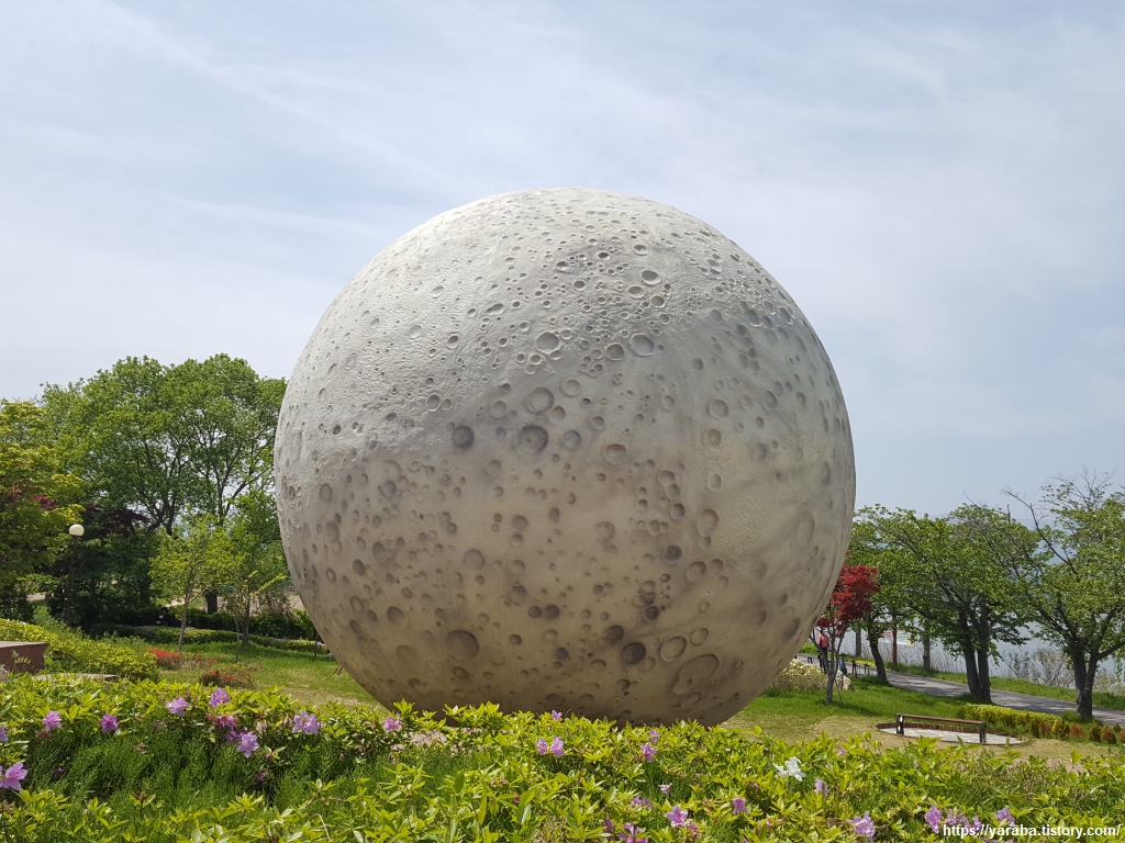 6미터에 달하는 대형 달 조형물. 낮이라 느낌이 덜하지만 밤에 조명을 받은 달 조형물은 제대로 자신의 모습을 뽐낼 것 같다. 경포호와 연관된 다섯 가지 달 이야기가 그 배경이다. 다섯 가지 달은 하늘의 달, 호수에 비친 달, 바다에 비친 달, 술잔에 비친 달, 님의 눈에 비친 달이라고 한다.