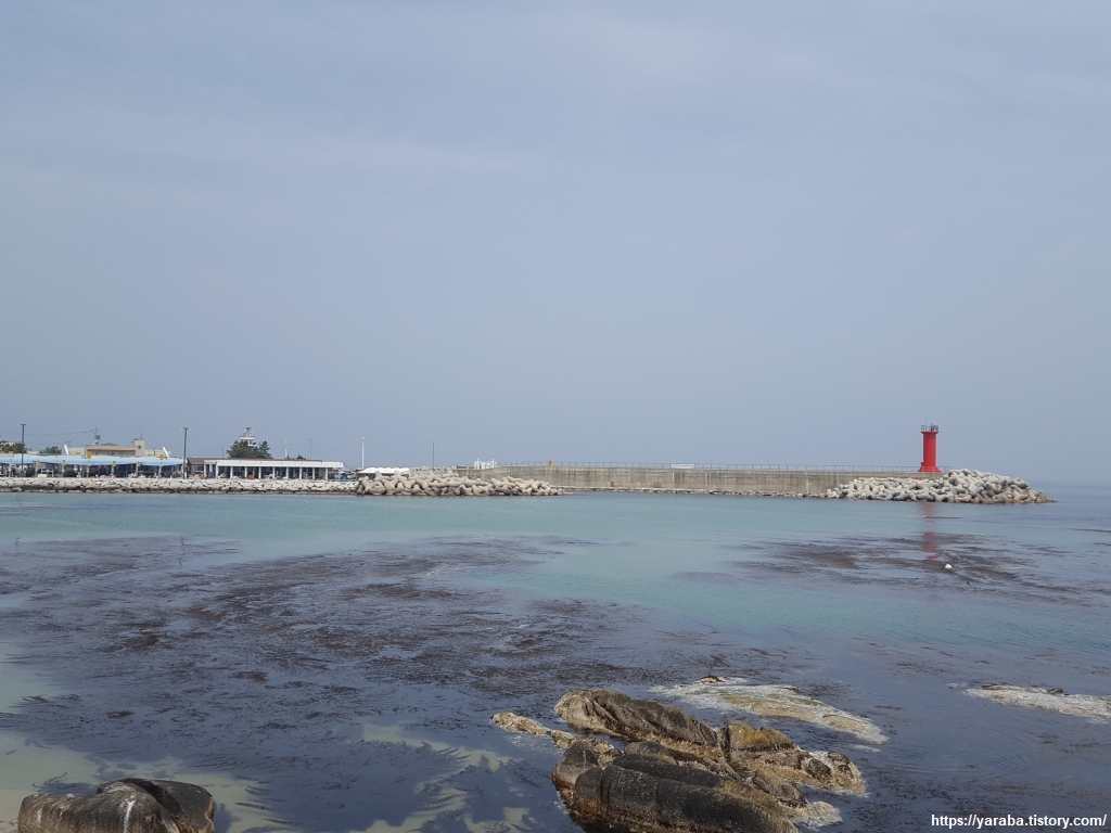 해안로로 내려오면 해안로 도로를 따라 길을 이어간다. 앞쪽으로는 작은 마을 어항인 오리진항이 있고 멀리로는 소돌항 방파제가 눈에 들어온다.