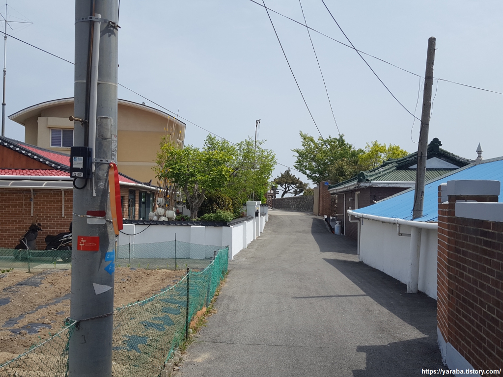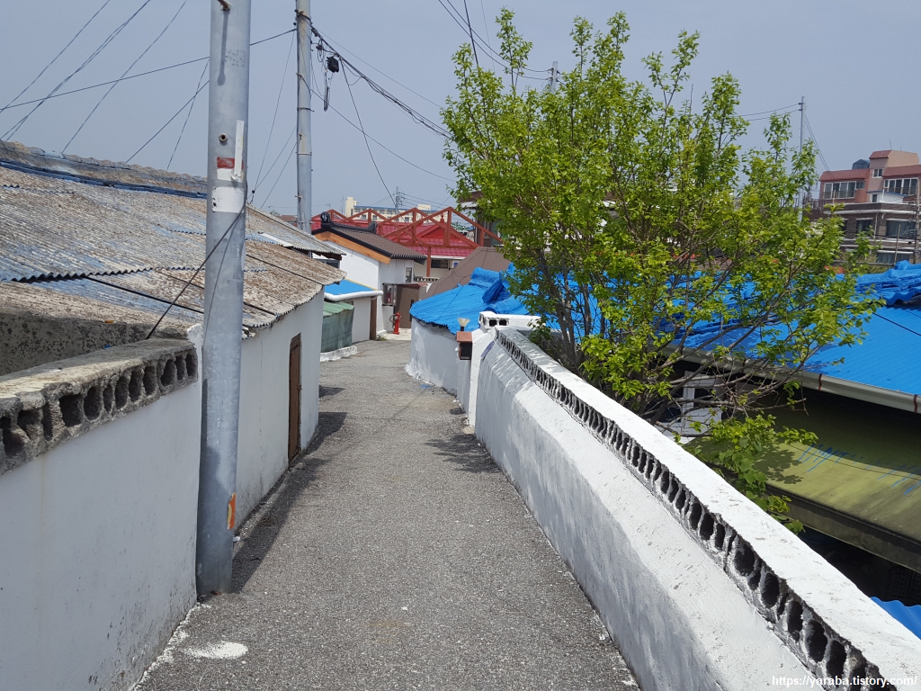 깔끔한 골목길로 그 옛날의 낭만을 느끼며 길을 이어간다. 건물벽도 담벼락도 깔끔하게 도색을 해놓은 마을이다. 등대 주위의 마을을 새뜰 마을이라고도 하는데 한국 전쟁 당시 피난민들이 모여 살았던 곳이라 한다. 전봇대에는 빨간색, 흰색 두줄 표시로 트레킹 경로임을 나타내고 있다.