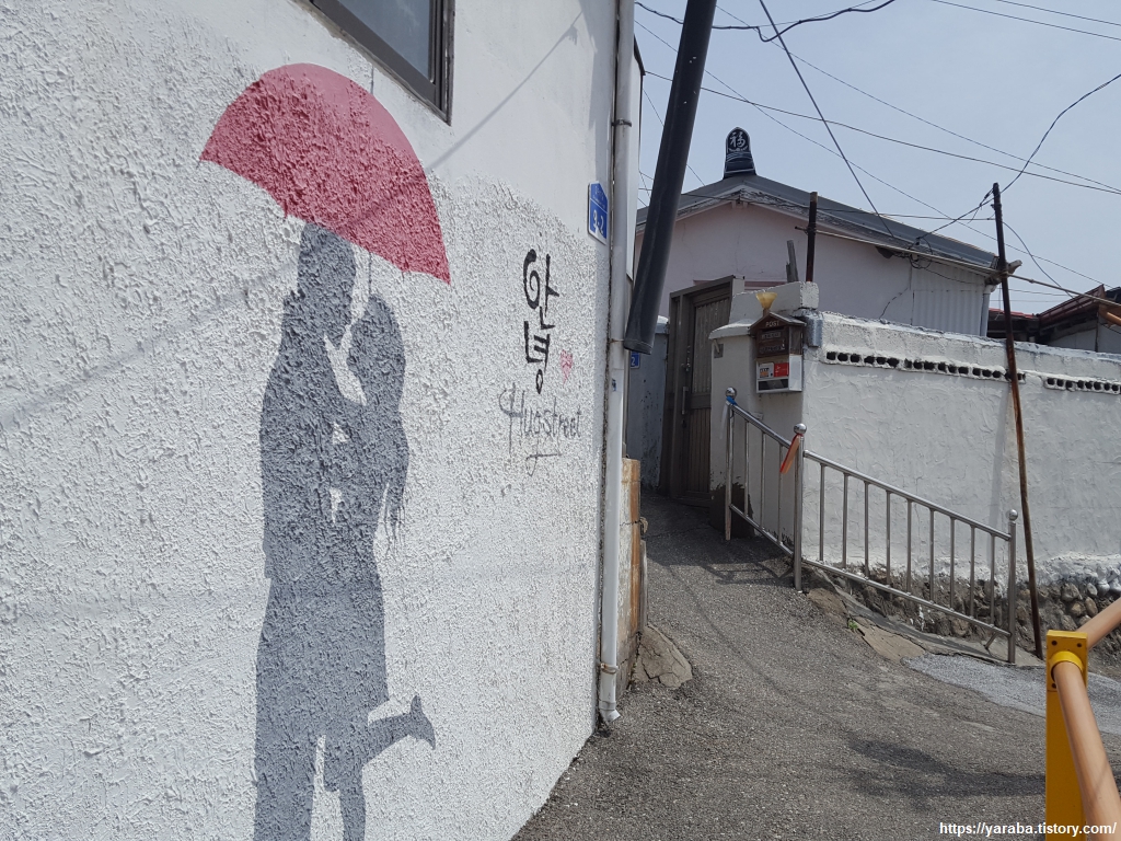 길을 천천히 오르는데, 힘겹게 언덕을 오르시는 어르신을 한분 지나쳐야 했다. 가볍게 인사를 하며 지나치지만 뻘쭘한 분위기는 어쩔 수 없다. 등대로 가는 길에 그려진 벽화는 예쁘지만, 과연 이런 그림은 어르신의 눈에는 어떻게 비칠까? 하는 궁금증이 생긴다. 아름다운 청춘 시절을 떠올리실까? 아니면 "아이고, 남사 스러라. 저걸 어떻게 매일 본다나!" 하실까?