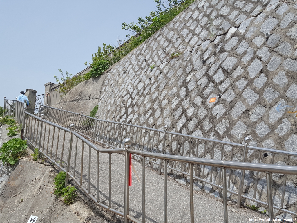 주문진 등대를 향해서 견치석으로 높이 쌓아 올린 석축 옹벽 길을 천천히 걸어 오른다. 개의 어금니를 닮아서 견치석이라 부르는 옹벽 재료는 전체적으로 보면 사각뿔 모양이다. 산소의 옹벽 쌓기는 이 정도 높이로 쌓지는 않는데, 높이 경사도를 극복하려니 힘든 공사도 극복했으리라......