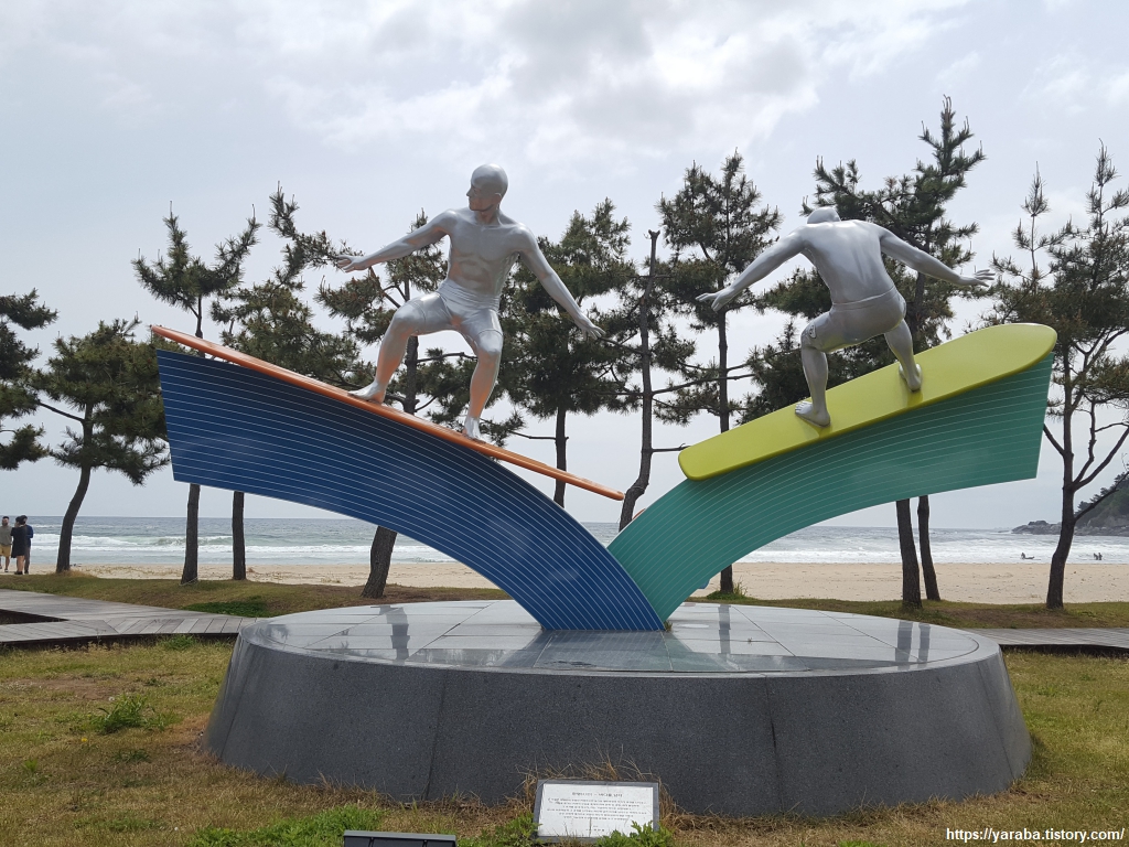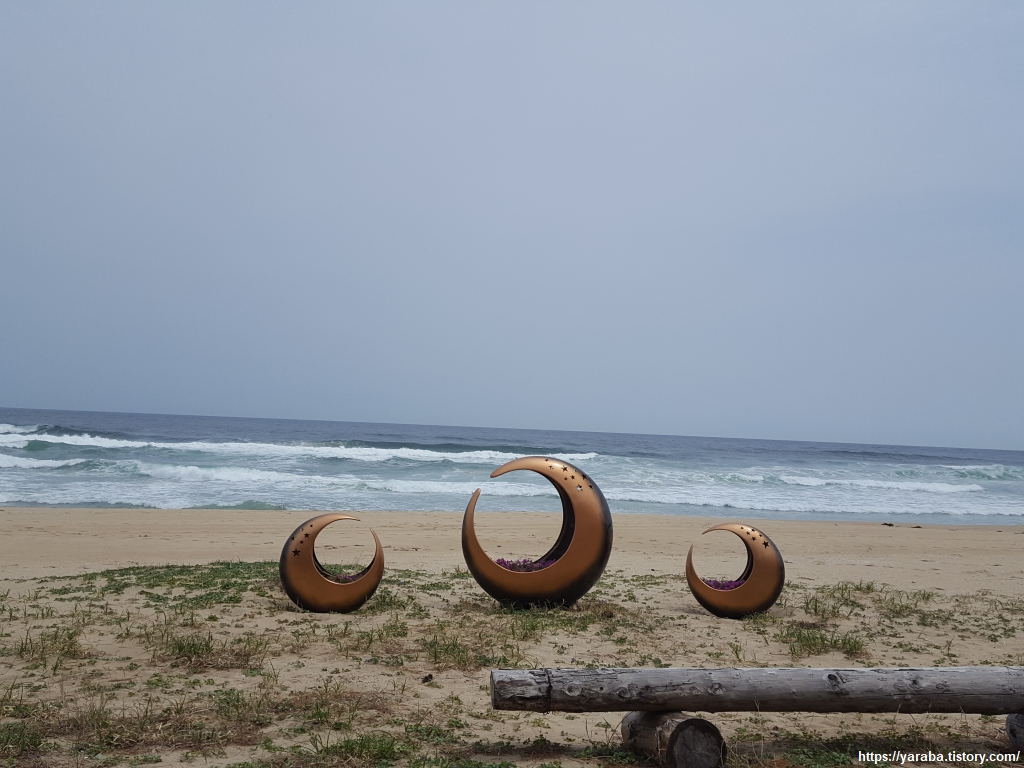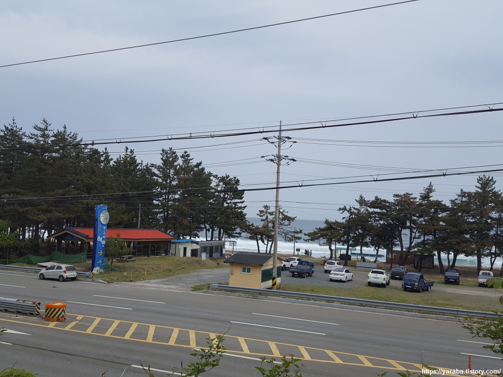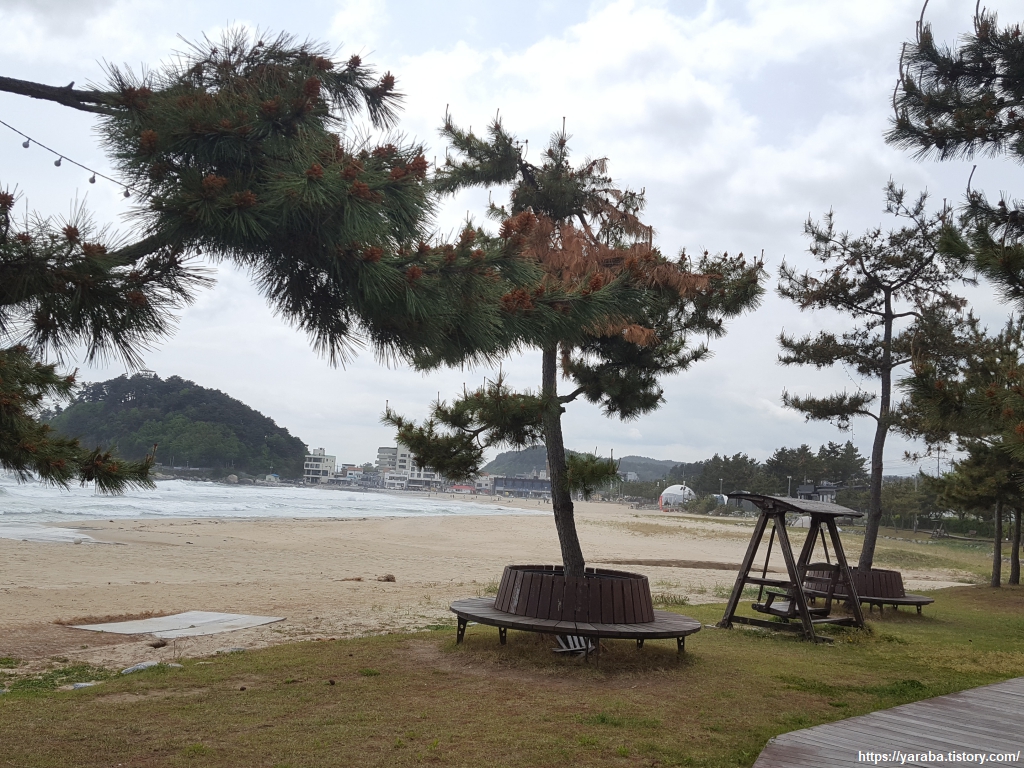 같은 바다 이어진 해변이지만 죽도 해수욕장에 비하면 이곳 동산포 해변은 시설도 깔끔하지만 조용한 편이다. 이곳에도 서핑 가게들이 있지만 분위기 차이가 크다. 죽도 해수욕장도 이곳 동산포도 해변으로 캠핑장들이 자리하고 있는데 연결된 해안이지만 동산포 캠핑장은 데크가 설치되어 있어서 안락한 캠핑이 가능하다고 한다.