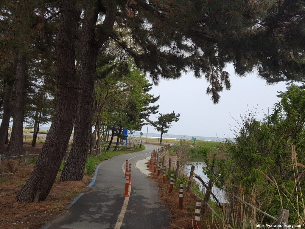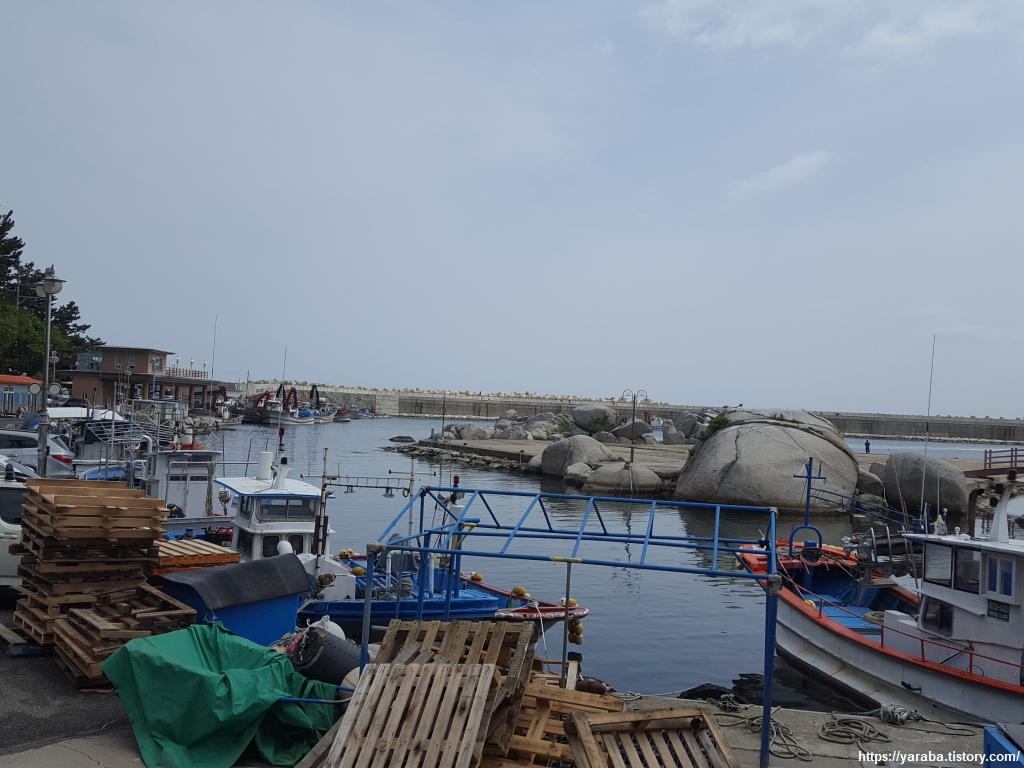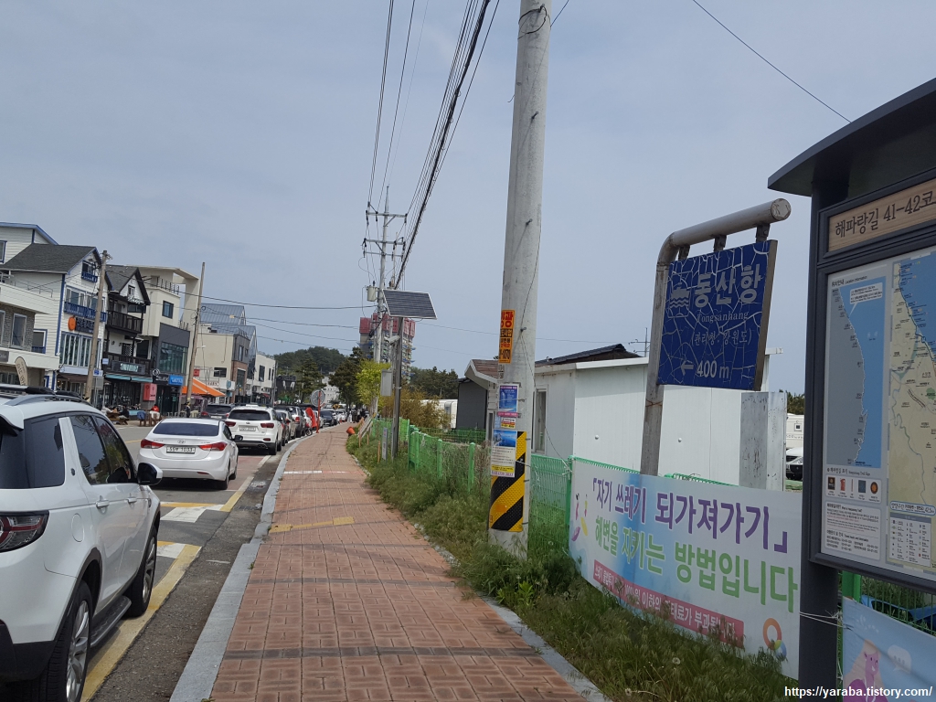 죽도 해변을 떠난 해파랑길 42코스는 동해안 자전거길과 길을 같이 한다. 동산항을 지나 북분리 마을길을 지나 잔교리에 이른다.