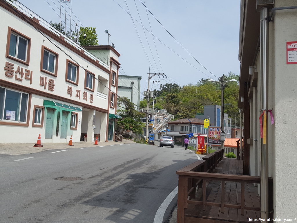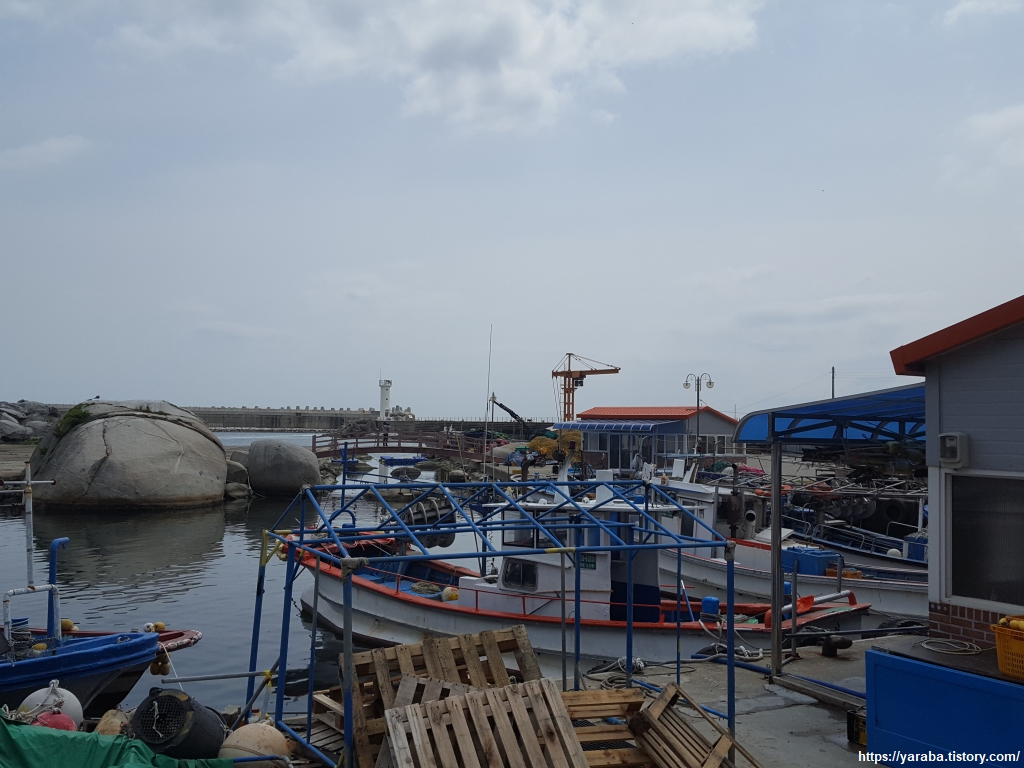 동산항을 돌아 나가는길, 항구 안에 커다란 바위 더미가 있는 모습이 독특하다. 동산이라 불린 것은 신라 때부터라고 한다.