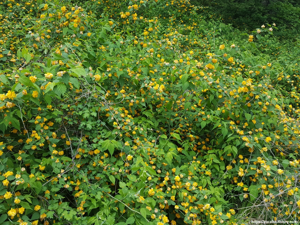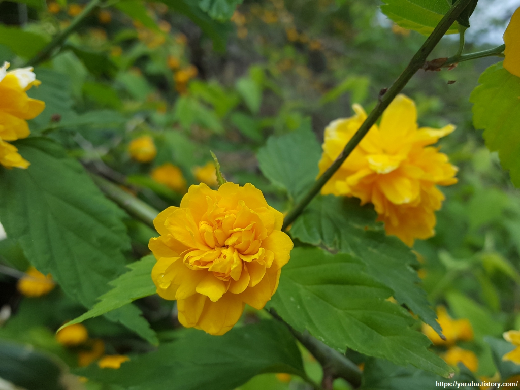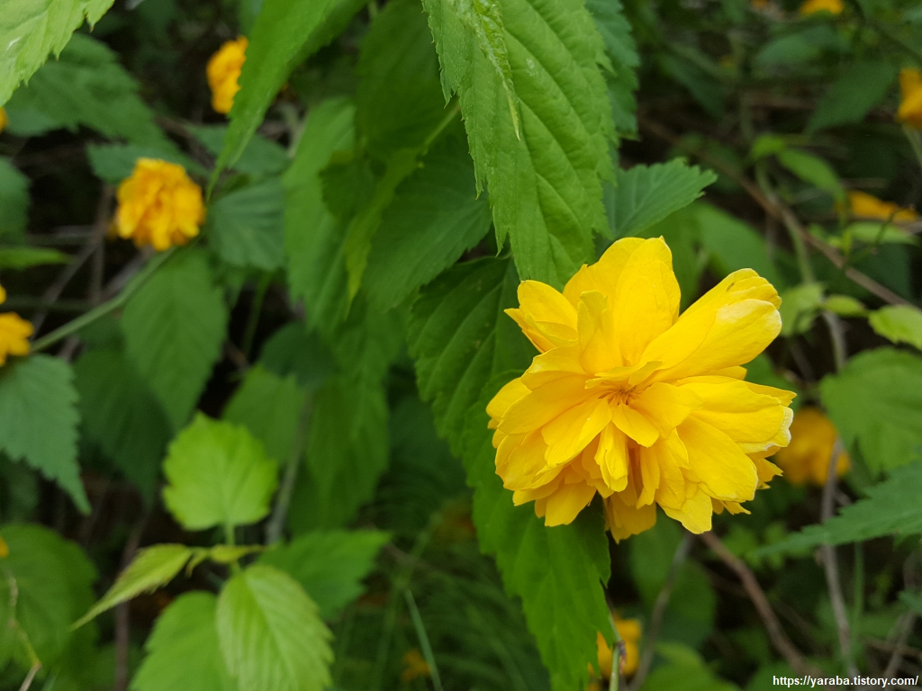 4월에서 5월까지 피는 죽단화이다. 겹꽃으로 겹황매화라고도 부른다.