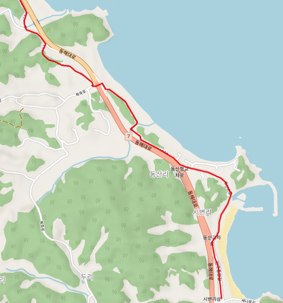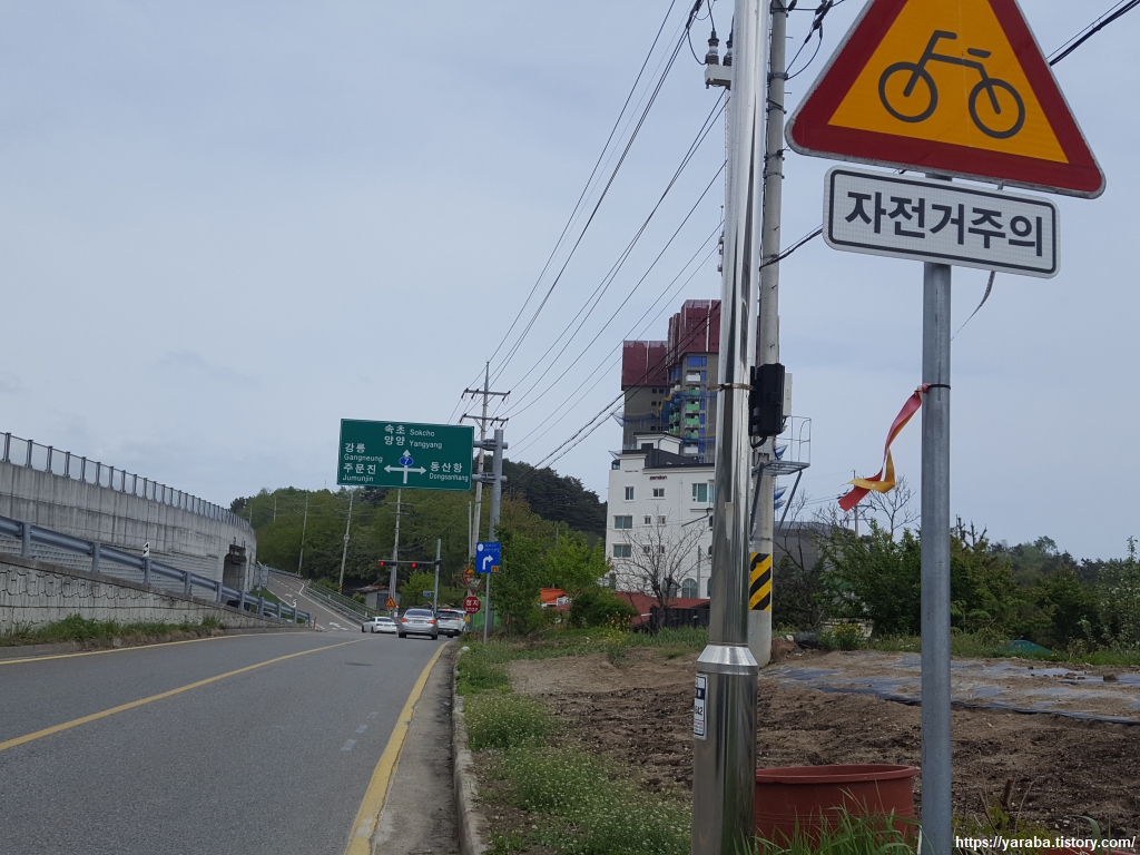 길을 잠시 7번 국도 인근으로 접근하지만 이내 동산리 마을 안쪽으로 들어간다. 양양군 시변리에서 동산리로 넘어간다.