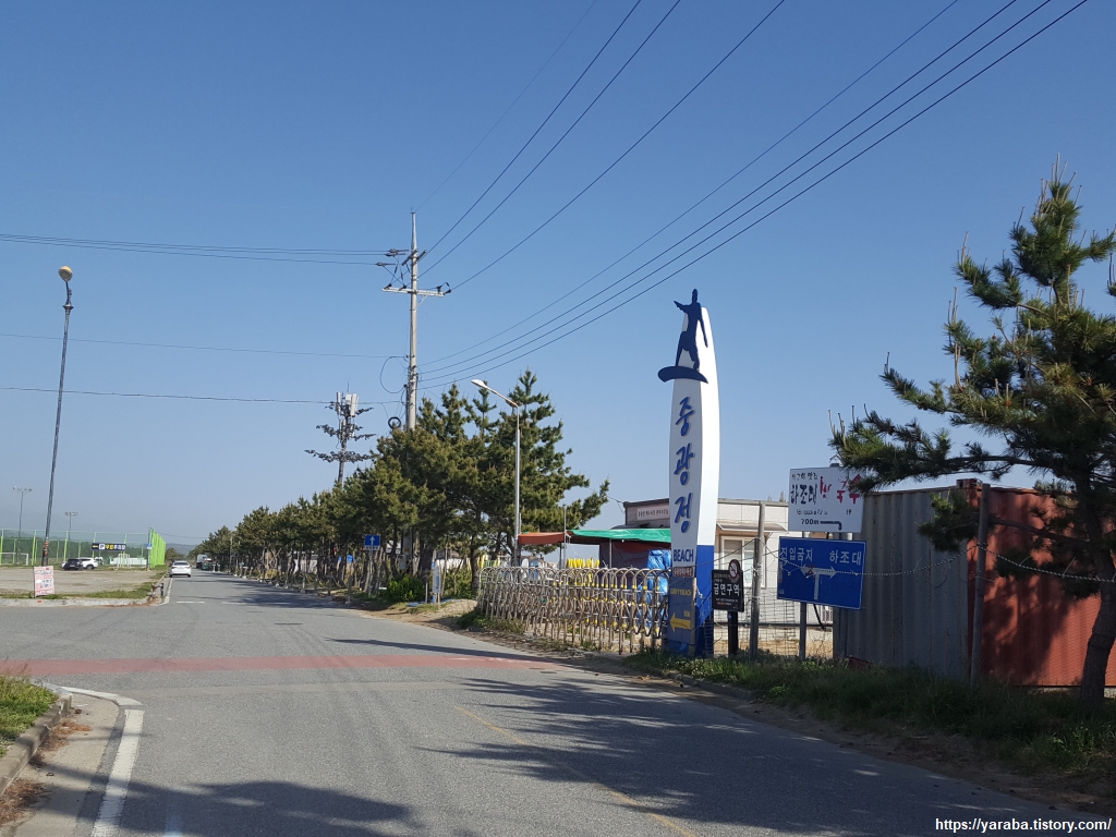 조용한 하조대 해수욕장을 걷다가 중광정리 해변을 만나면 좌회전하여 7번 국도 방향으로 이동한다. 사람이 많이 찾는 곳이다 보니 인도를 아예 무료 주차장으로 만들고 해변으로는 사람들이 걸어 다닐 수 있는 데크길을 별도로 만들어 놓았다. 해파랑길을 걸으며 만난 해수욕장들은 지방 자치 단체에서 주차장을 넉넉하게 만들어 놓은 것을 볼 수 있었는데 잘했다 싶다.