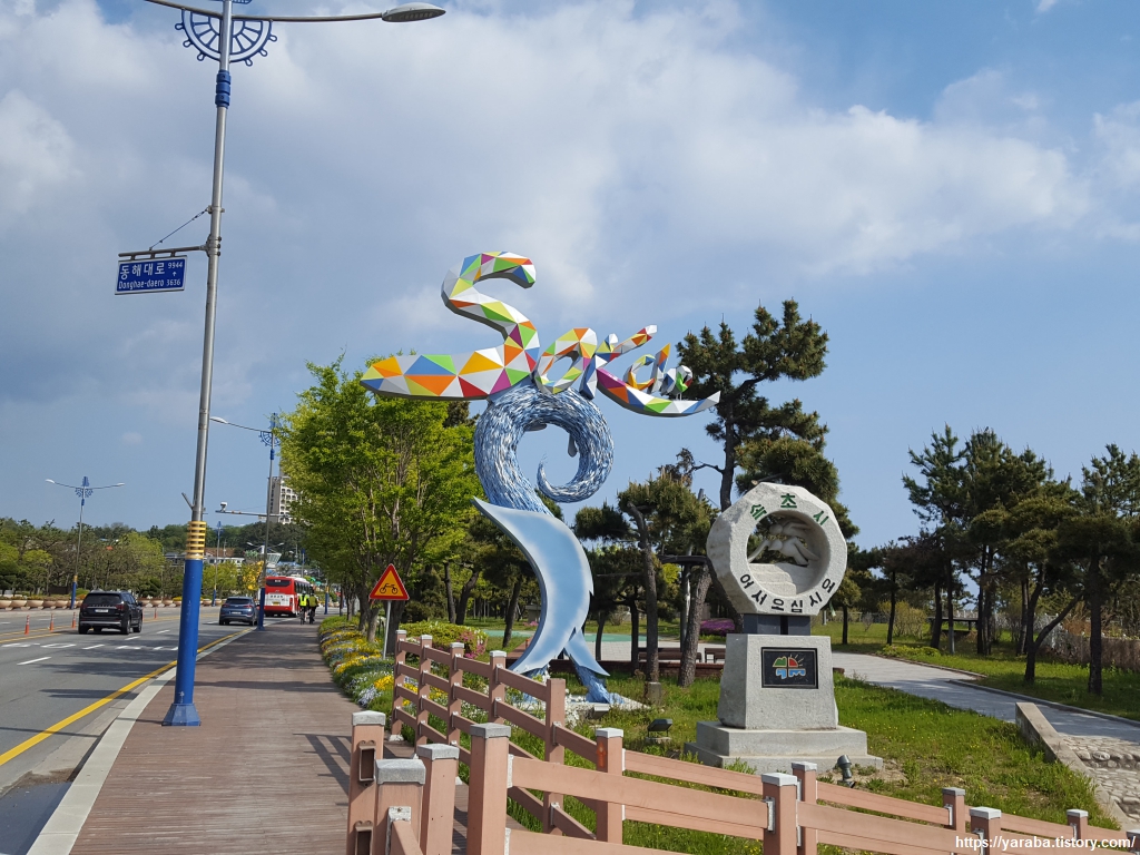해파랑길 44코스는 설악 해맞이 공원 주차장에서 끝나고 45코스를 통해서 속초를 본격적으로 걷는다. 길 건너는 설악동으로 들어가는 입구다. 청년 시절 등산에 대해 아무런 지식도 없이 쓰지도 않을 텐트를 둘러메고 비가 주적주적 오는 가운데 친구들과 대청봉을 올랐었다. 대청봉 산장 근처에서는 거의 기어갈 정도였는데 오색 쪽에서 올라간 것 등 일부만 기억에 남고 다른 기억은 사라진 지 오래다. 신혼여행 때도, 아이들을 데리고도 저 입구를 여러 번 지나갔을 텐데, 걸으면서 보는 느낌은 완전히 새로운 장소 같다. 기억도 물이 흘러가듯 흘러가는 모양이다.