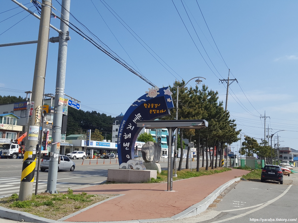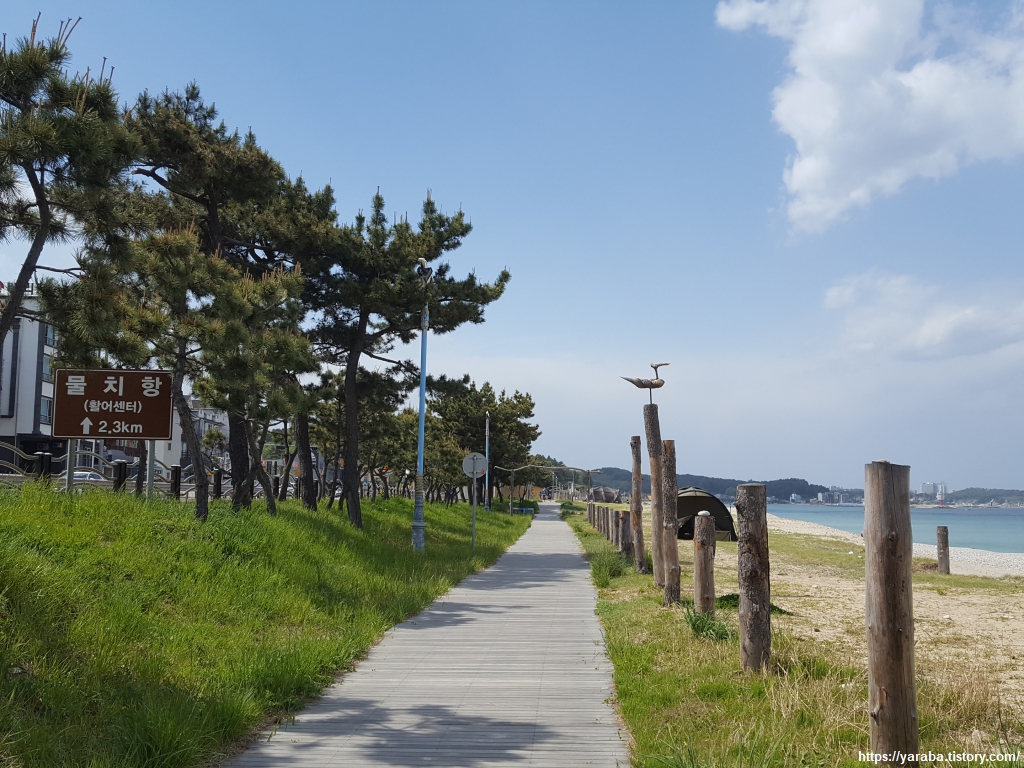 "황금물결, 은빛 모래"를 자랑하는 물치 해변 표지판 앞에서 잠시 쉬어간다. 걷기 초반 화장실 다녀오기는 필수다.