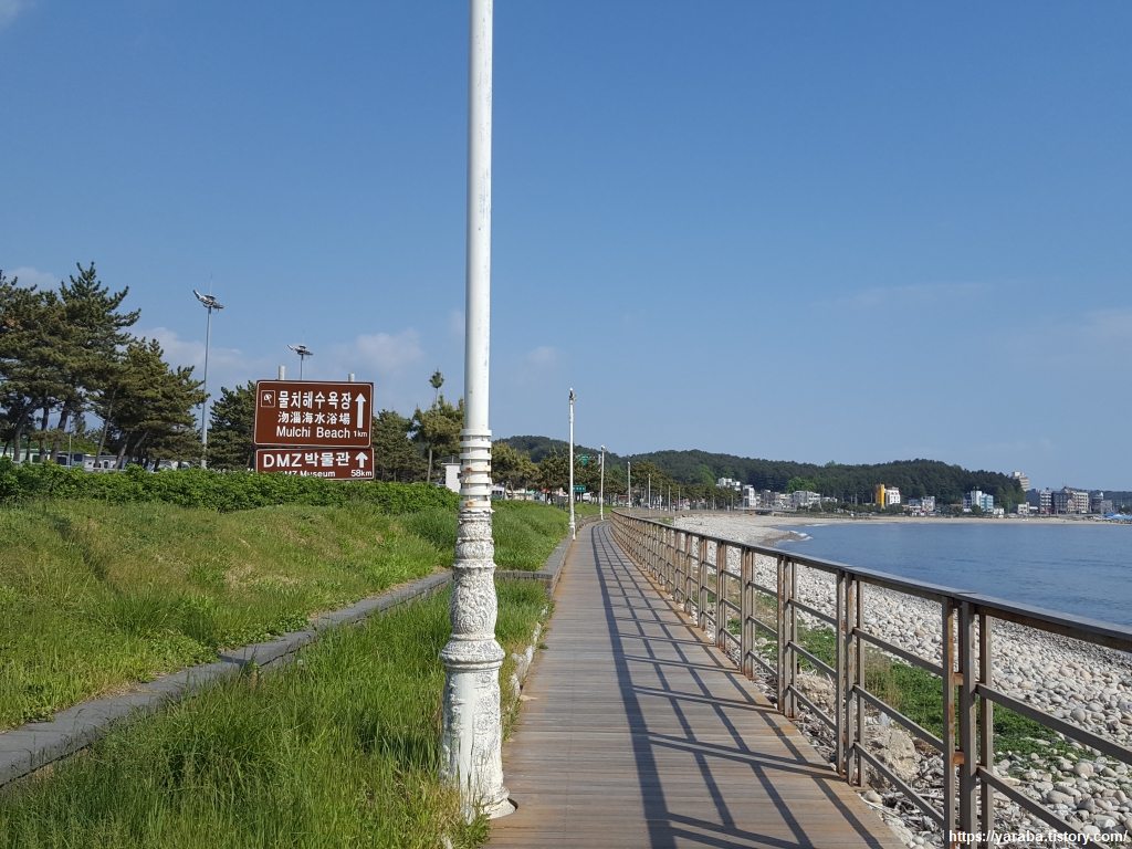 좌측으로는 국도를 달리는 자동차 소리, 우측으로는 몽돌을 굴리는 파도 소리, 허리에는 폰에서 흘러나오는 잔잔한 음악 소리를 들으며 물치항을 향해서 길을 이어간다. 드디어 해파랑길 끝에 위치한 DMZ 박물관이 58Km 앞에 있다는 표지판이 등장했다. 해파랑길 걷기도 종반을 향해서 가고 있다.