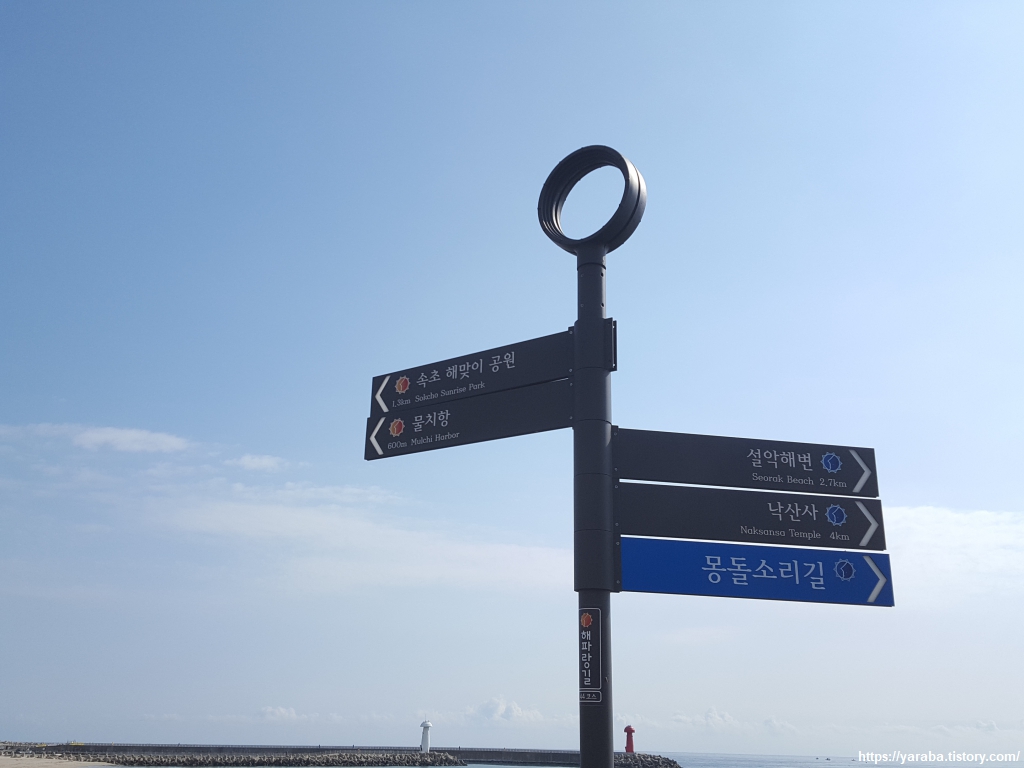 다음날 아침 오늘도 쾌청한 날씨로 하루를 시작한다. 해파랑길 44코스의 종점인 속초 해맞이 공원 표지판이 등장했다. 얼마 남지 않았다.