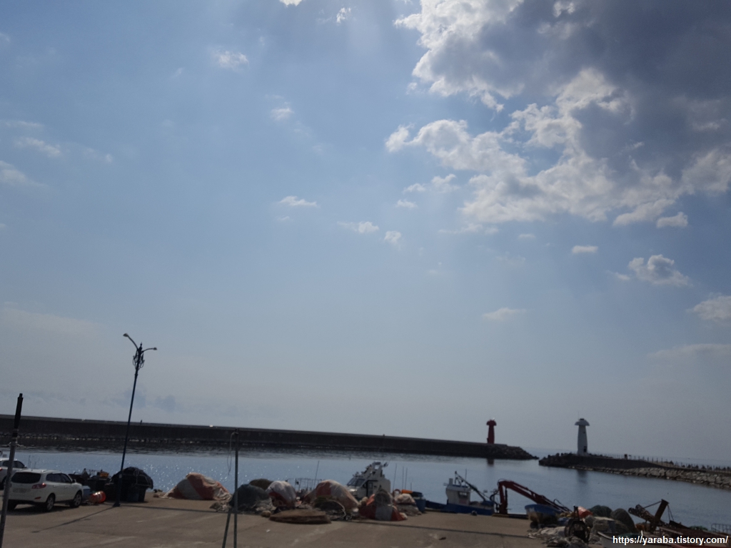 물치 해변도 주차장이 넓어서인지 곳곳에서 차박 캠핑하는 분들이 많았다. 물치항 방파제 위에 나란히 서있는 송이 등대를 뒤로 하고 길을 이어간다.