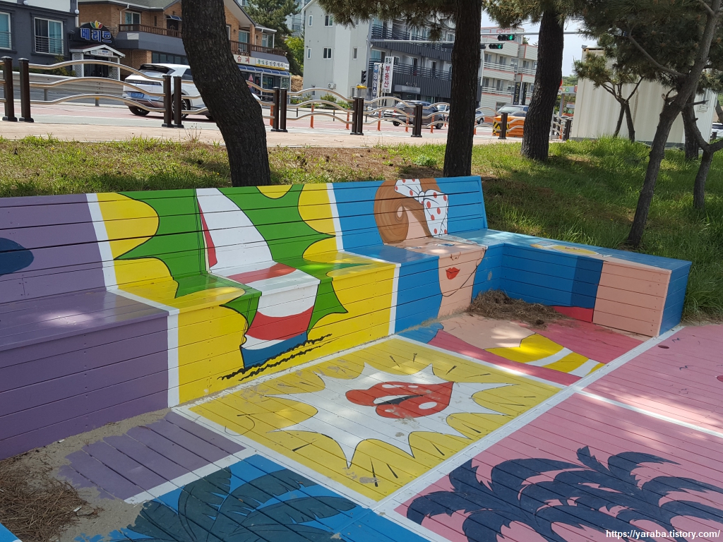 통나무 기둥에 올려진 솟대, 벤치에 그려진 그림, 다양한 조형물까지 자연스러운 멋이 훌륭한 해변이다. 양양 비치 마켓 예술 작가들과 협업했다고 한다.