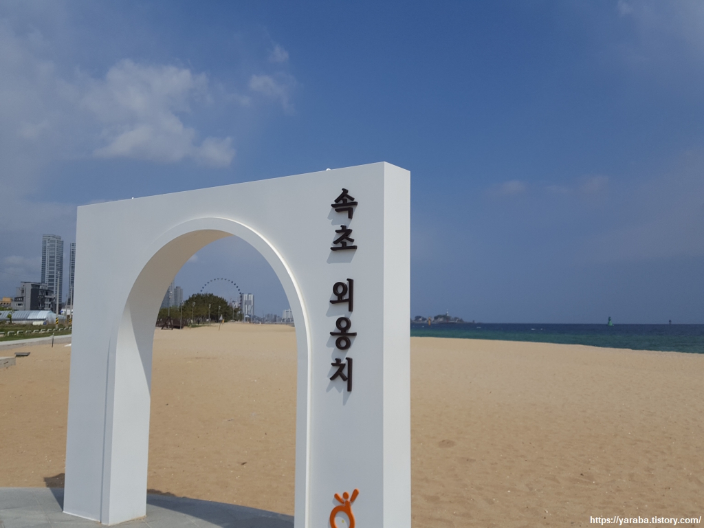 속초 해변은 두바이나 아부다비의 마천루가 가득한 화려한 해변에 온 것이 아닌가 착각할 정도의 뷰를 보여준다. 맑은 바다, 하얀 백사장, 높이 솟은 건물들까지 이국적인 모습이다.