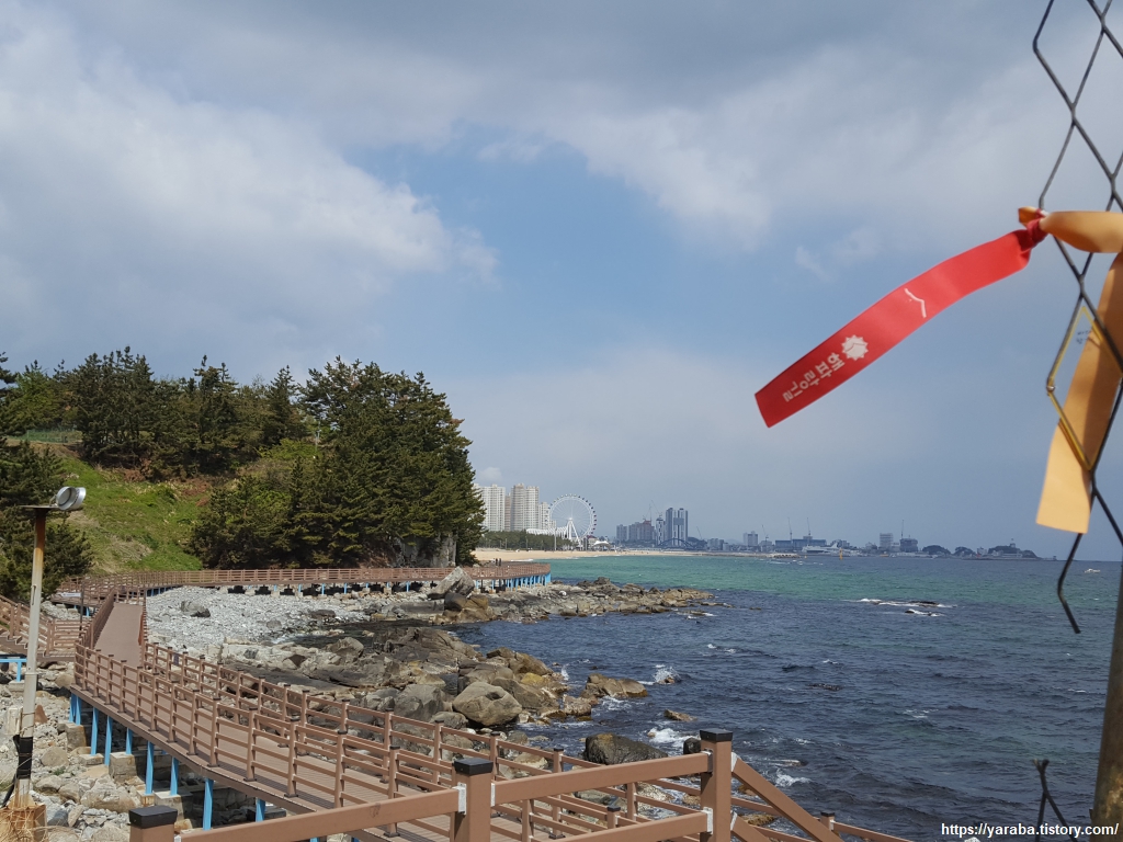 멀리 대관람차가 있는 화려한 속초 해변을 보면서 해안 산책로를 이어간다.