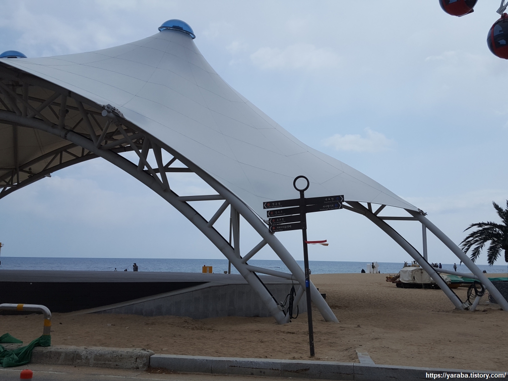 2022년 봄에 생긴 속초 아이 대관람차 덕분에 속초 해변의 뷰는 엄청나게 바뀌었다. 대관람차를 직접 타는 즐거움도 있겠지만 대관람차 자체가 지역의 랜드마크로서의 역할을 하니 요즘 세대 사람에게는 속초 하면 떠오르는 것이 이것이 되겠다는 생각도 든다. 대관람차 앞의 파이프로 만든 대형 조형물의 이름은 이철희 작가의 "Falling in love - Kiss"라는 작품이다. 파이프라는 독특한 재료가 만드는 감성적이 형상이 사람들의 이목을 끌기에 충분하다. 파이프를 따라 바람도 드나들고, 반대편의 시야도 드나드는 독특한 설치 예술품이다. 거대한 공영 주차장이 바로 앞이고, 속초 고속 터미널이 5분 거리이니 이곳은 정말 핫한 장소일 수밖에 없다.