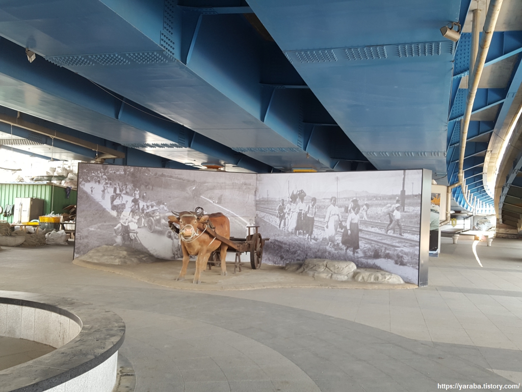 다리에 설치된 승강기나 계단을 이용해서 다리 아래로 내려오면 아바이 마을이다. 교각을 따라 갯배 타는 곳으로 이동하는 도중에는 아바이 마을의 엣 풍경을 사진과 조형물들을 통해 재현해 놓았다.