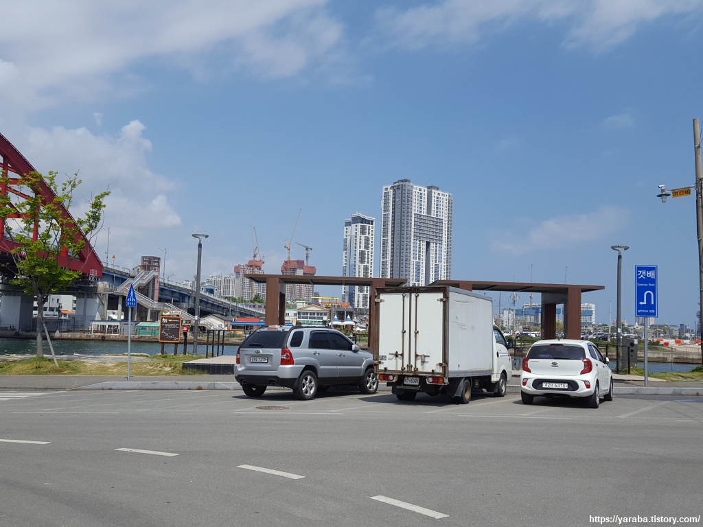 갯배를 내려서 직진하면 속초 관광 수산 시장, 아바이 순대 타운으로 바로 갈 수 있다. 옆지기에게 가고 싶냐고 물으니 몰라서 그랬을까? 아니면 아직 갈길이 멀어서 그랬을까? 간식 천국, 쇼핑 천국을 외면하고 계속 길을 가자고 한다. 해파랑길은 갯배를 내려 바로 우회전하여 구수로길을 따라 걷는다. 구수로 양쪽에는 수많은 어선들이 정박해 있고 구수로 위로는 금강대교가 아바이 마을과 중앙동을 이어주고 있다. 구수로를 따라서는 속초 생선 구이 거리가 있었는데 때마침 출출한 시간이라 거리에 퍼지는 생선구이 냄새를 외면하면서 걷기란 보통 곤욕이 아니었다. 생선구이라고 이름 붙은 메뉴들은 왜 이리 가격이 비싼지 쉽게 가게 안으로 발걸음이 옮겨지지 않았다. 생선구이 좋아하는 옆지기는 아마도 그냥 손잡고 들어가 주기를 바라지 않았을까?