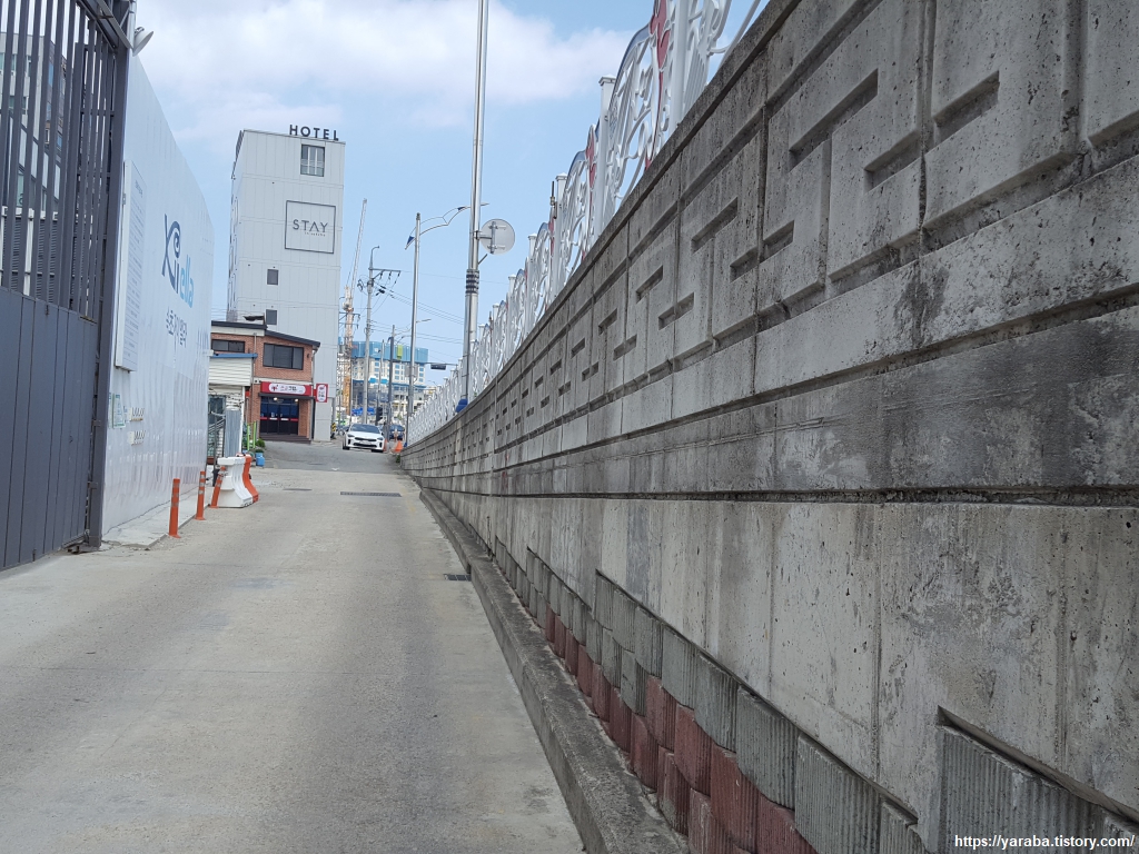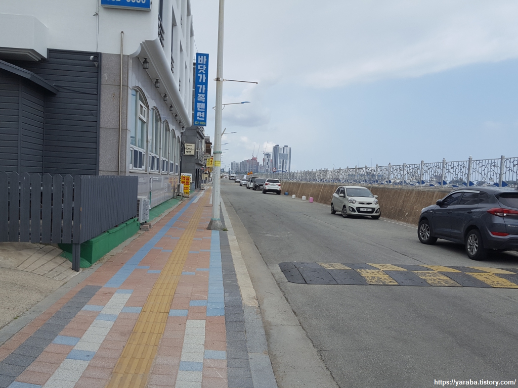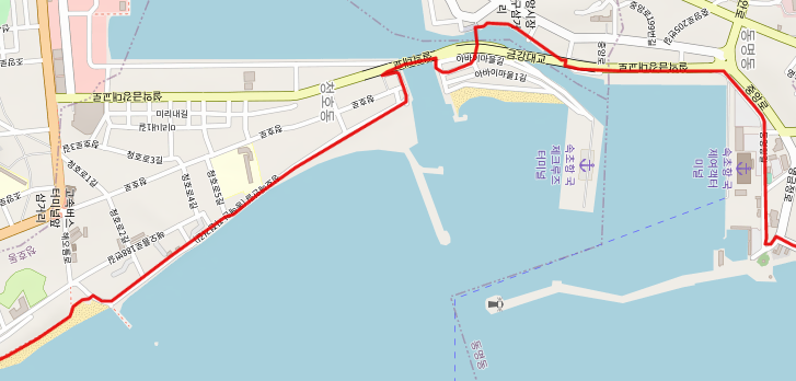 속초 생선 구이 거리를 빠져나오면 바로 우회전하여 구수로를 건너온 금강 대교 바로 앞에 있는 신호등 횡단보도로 길을 건너 반대편 길에서 중앙로 거리를 걷는다. 속초항을 따라 걷는 길이다.