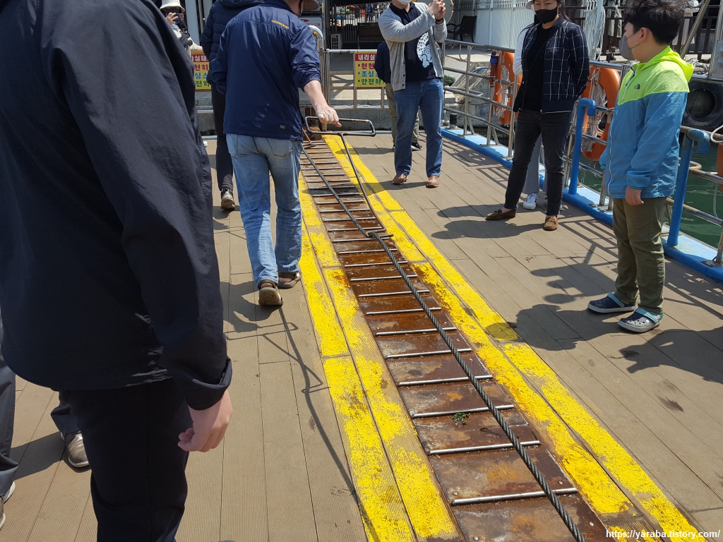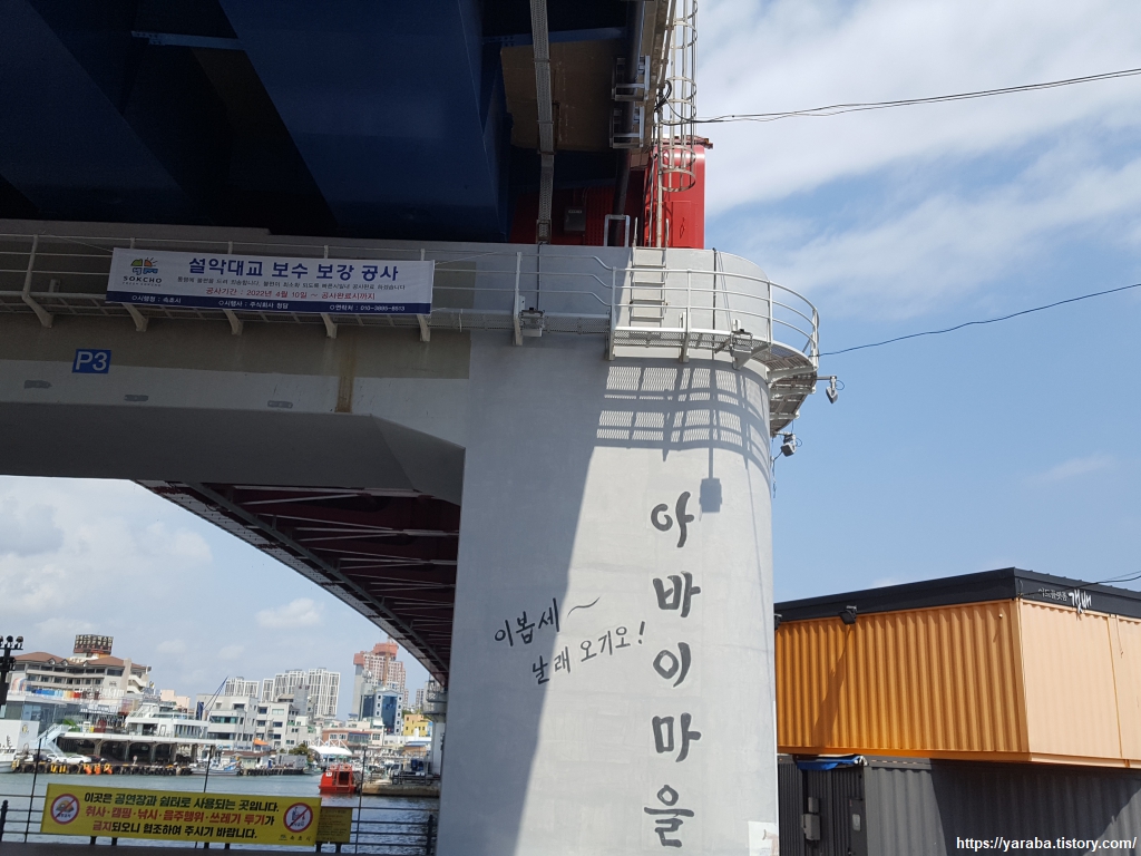 설악대교 교각에 새겨진 갯배의 모습. 방송에서도 여러 번 보았고, 탔던 경험도 있는데 접근하는 경로가 다르니 완전히 새롭다. 승강기를 타고 설악대교 중간으로 올라가서 다리를 건넌 다음 다시 다리 중간에 있는 승강기로 내려가면 아바이 마을로 갈 수 있다.