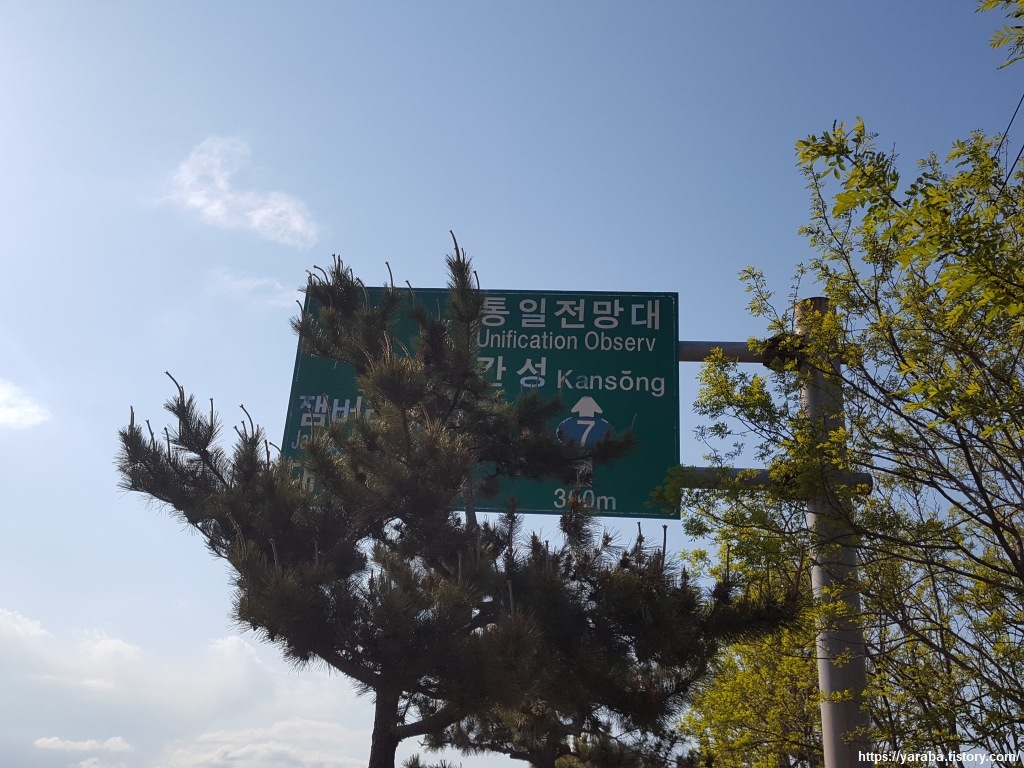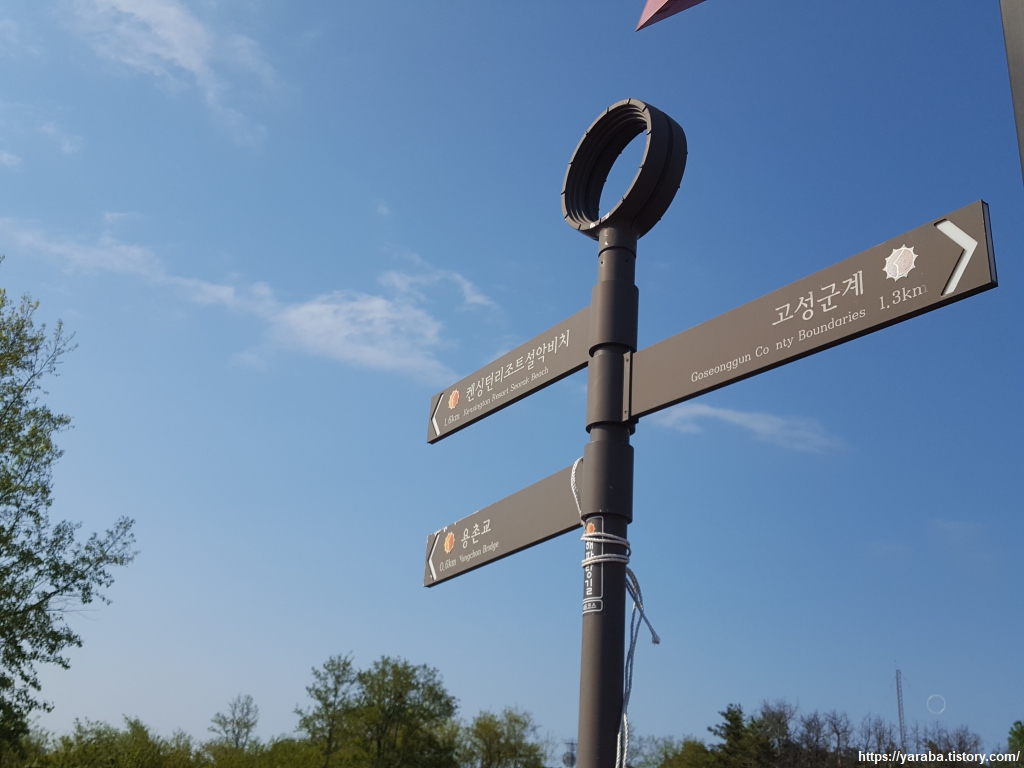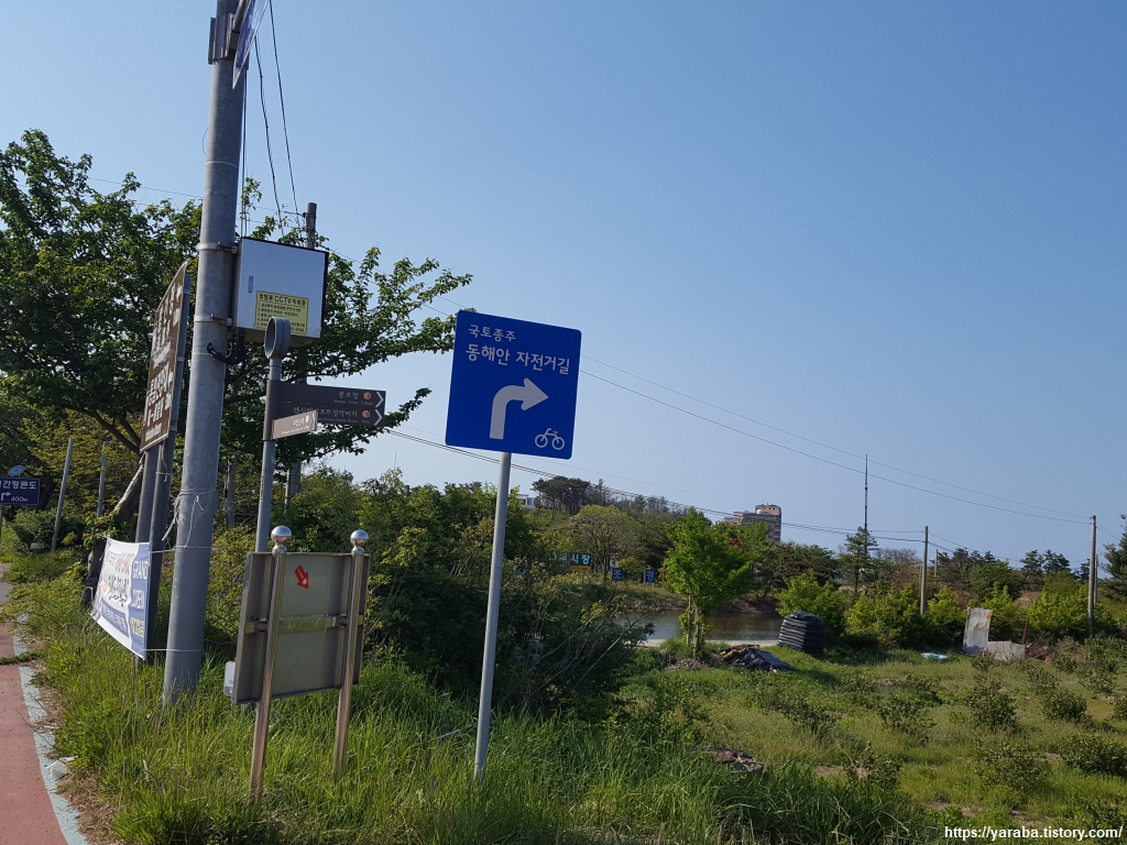 중앙로 도로로 나오면 다시 도로변 길을 따라서 길을 이어간다. 용촌천을 건널 때까지는 도로변을 걸어야 한다. 고성에 들어서니 해파랑길의 종점인 통일 전망대 표식이 등장하기 시작한다.