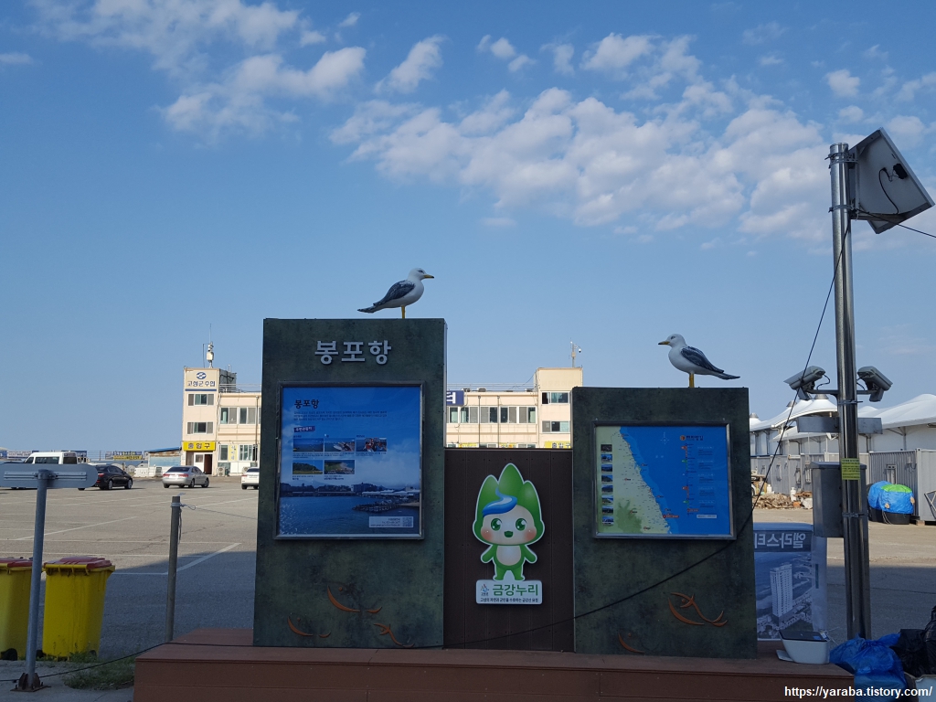 봉포항 입구에는 갈매기 조형물과 함께 금강 누리라는 캐릭터가 중앙에 붙어 있다. 아마도 고성군이 품고 있는 금강산이 핵심인 듯싶다. "고성의 자연과 군민을 수호하는 금강산 요정"이라는 설명이 있다. 한국 전쟁 이전에는 38선 이북이라 설악산도 속초도 고성도 북한 지역이었다는 것을 상상하기 어렵고 지금이 휴전 상태라는 것이 실감도 나지 않는다.