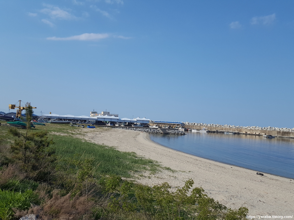 고성의 첫 해변은 용촌리 해변이다. 요양원과 초대형 카페가 들어서 있는 이곳은 카페를 방문한 사람들이 해변을 즐기고 있을 뿐 한적하다.