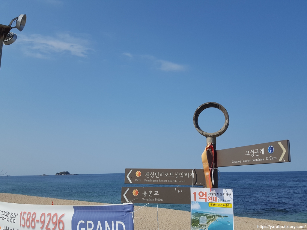 나지막한 언덕을 넘어서면 드디어 속초시에서 고성군 토성면 용촌리를 들어간다. 마을길을 만나면 우회전하여 해변으로 이동한다.