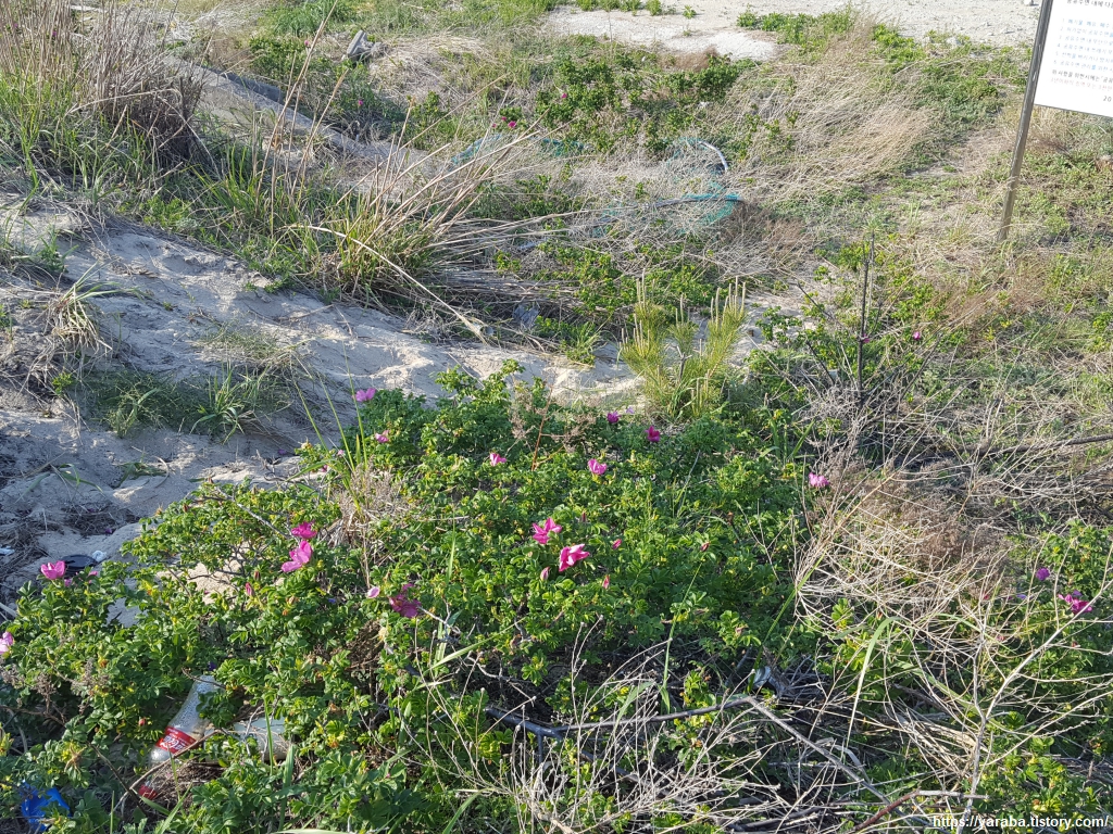 해안 모래밭에 자리 잡은 해당화가 시선을 사로잡는다.