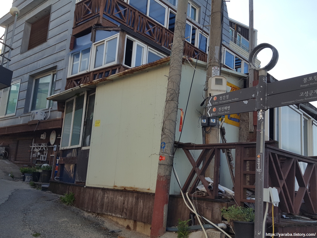 봉포항을 빠져나와 토성로 해안 도로를 따라 천진항으로 향한다. 봉포리는 인근에 아파트 단지와 대형 마트도 있고 대학교와 초대형 골프장도 있는데 해변을 따라 수많은 펜션들이 자리하고 있는 독특한 지역이었다. 병원과 5성급 호텔까지 들어설 예정이다. 속초 인접 지역이라는 메리트가 작용하지 않았나 싶다.