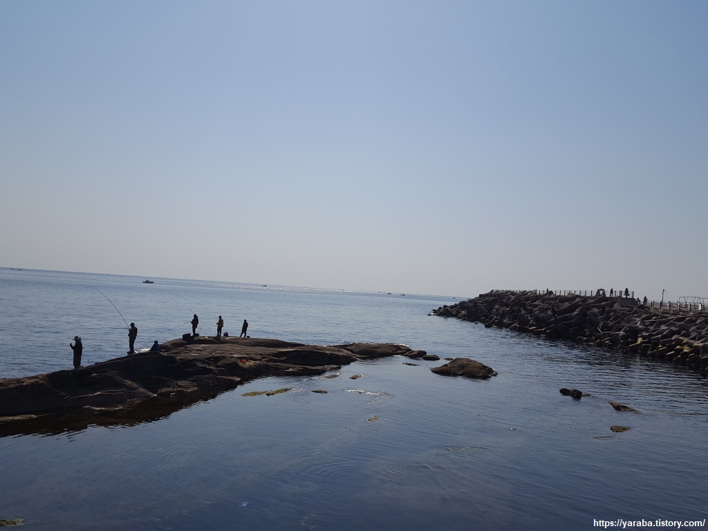 아야진항을 떠나 아야진 해변으로 가는 길은 평일임에도 낚시꾼들로 바위가 가득하다. 평일이 이 정도면 대체 주말 풍경은 어떨까? 상상이 가질 않는다. 대체 얼마나 고기가 잘 잡히길래 이렇게 사람들이 많을까? 하는 호기심이 발동했다. 주차하기 쉽고 바위 지대라 걸림 없이 낚시할 수 있다는 정도가 내가 할 수 있는 추측의 범위였다. 주차장에는 캠핑카에서 아침을 준비하고 계신 분들도 있었다.