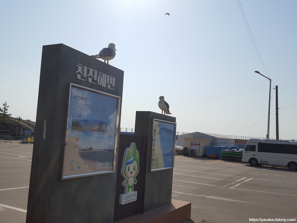 천진 해변도 봉포항과 같은 형태의 표지판이 서있다. 금강 누리 캐릭터는 고성을 걸으면서 얼마나 친해질 수 있을까?