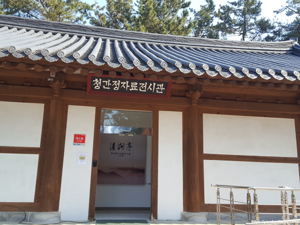 데크길을 통해서 천진천을 건너면 관동팔경의 하나인 청간정 입구에 도착한다. 기암절벽 위의 팔각 정자를 보려면 산 위로 올라가야 하지만 공사 중이라 볼 수 있는 것은 청간정 자료 전시관뿐이다.