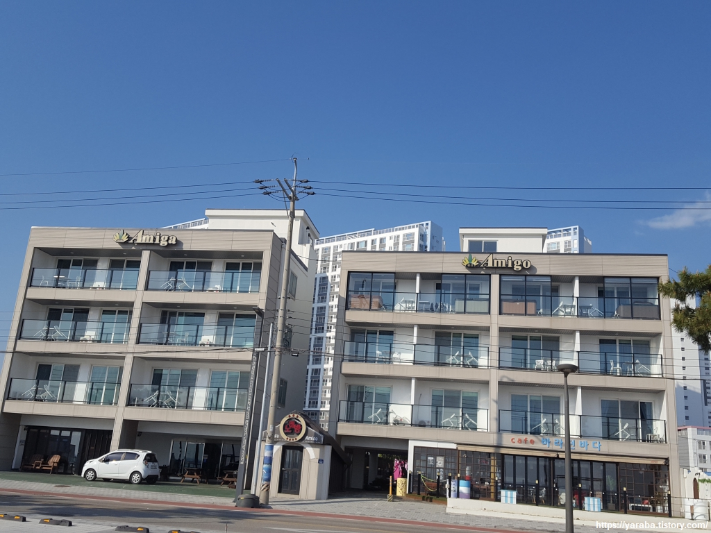 오늘은 봉포 해변에 있는 아미가 아미고 펜션에서 쉬어간다. 인근에 마트도 있고 깨끗해서 좋았다. 재미있는 것은 아미가 아미고가 스페인어로 여자 친구, 남자 친구라는 의미인데 아미가 건물 따로 아미고 건물 따로였다. 아마도 급이나 종류가 다른 모양이다.
