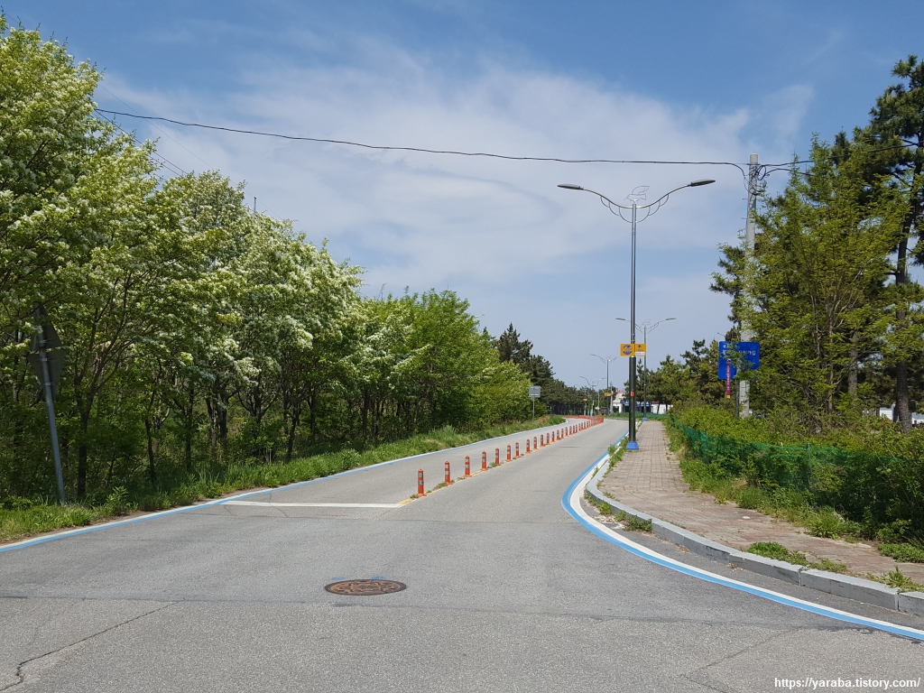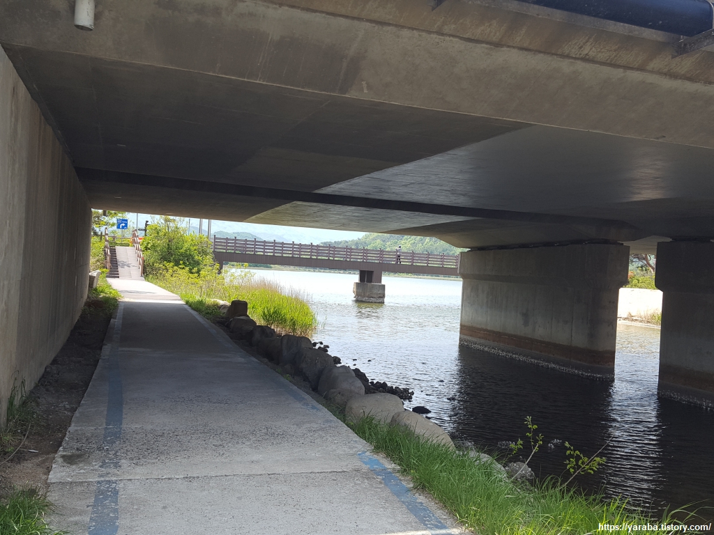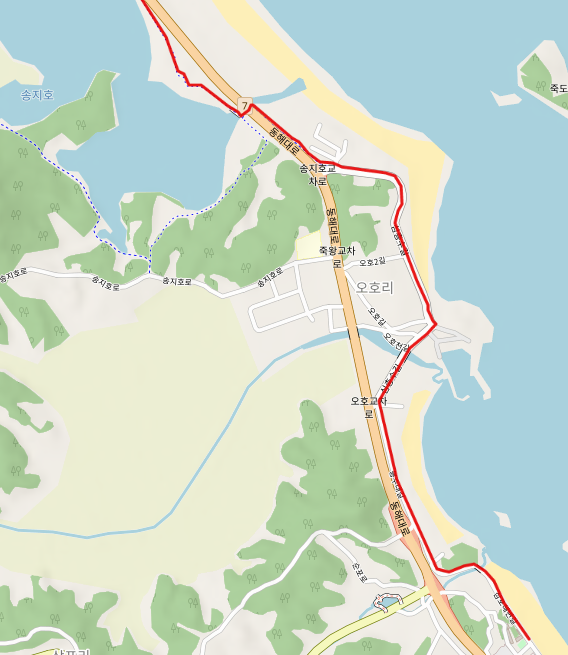 심층수 공장 지대를 지나면 직진하지 말고 좌회전하여 7번 국도 아래 굴다리를 지나 송지호 호수로 진입한다.
