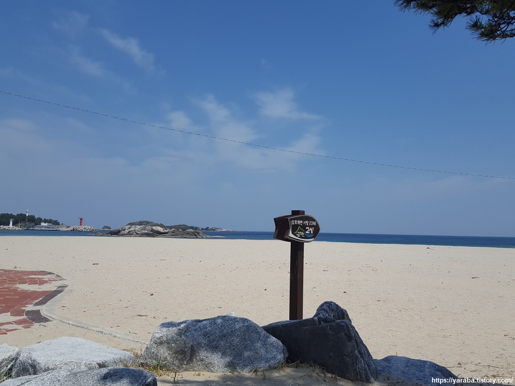 삼포 해변 서핑 존이라는 팻말 뒤편으로 섭바위와 오호항의 방파제가 보인다.