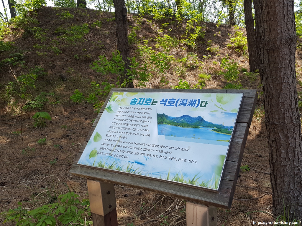 송지호 옆 숲 속 산책길을 따라 올라간다. 곳곳에 벤치 안내판이 설치된 아름다운 송지호 쉼터를 걸어간다.