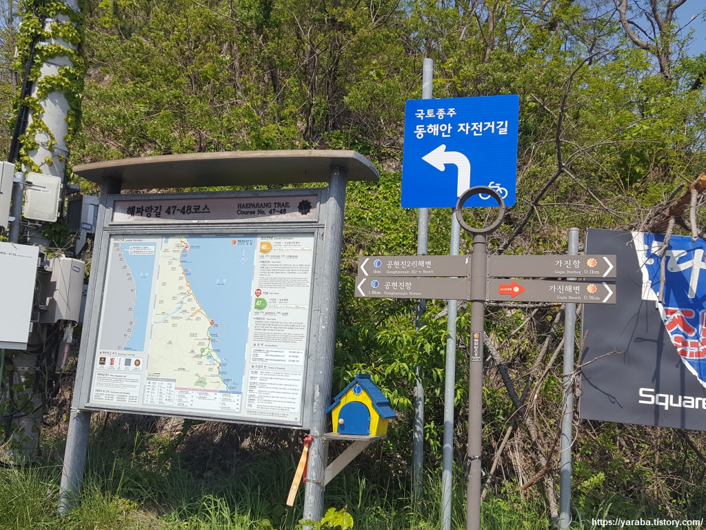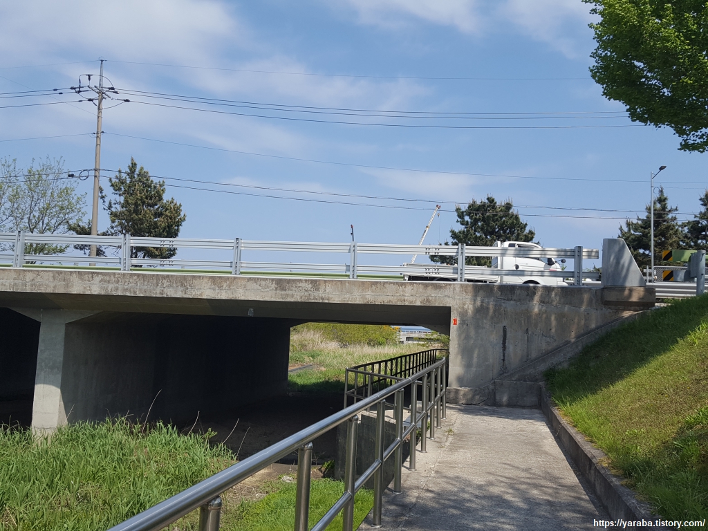 해파랑길에서 보기 어려운 독특한 길 흐름이다. 공현진교 아래 굴다리를 통과하자마자 우측으로 올라가 다시 우회전해서 공현진교를 건너는 방법이다.