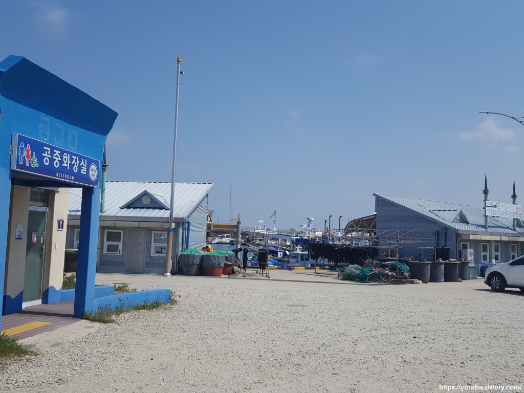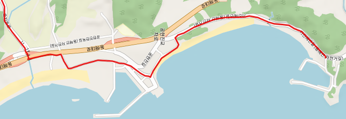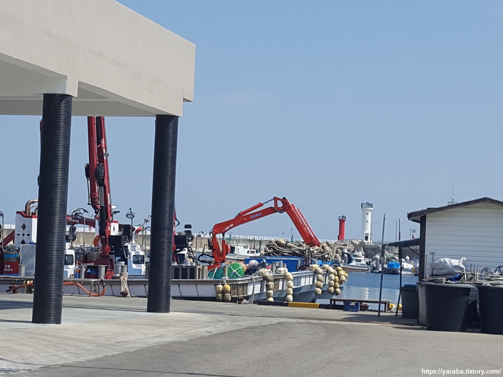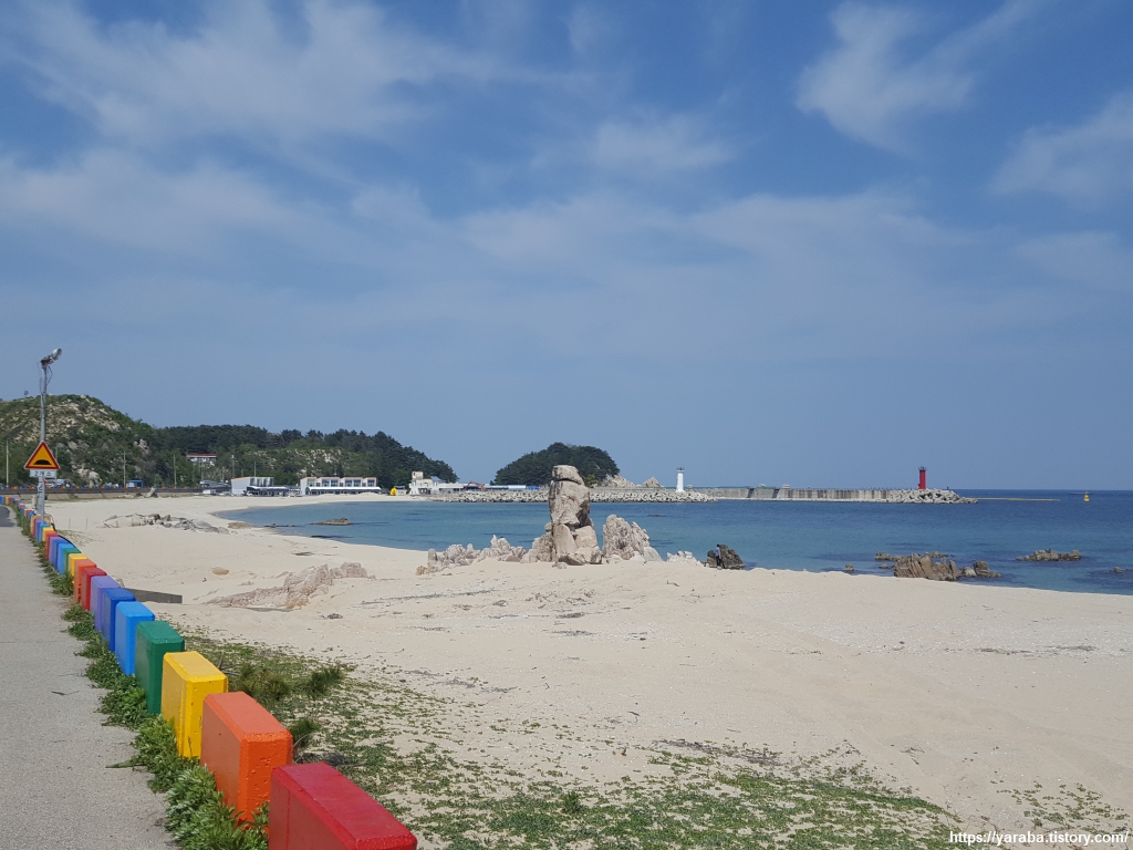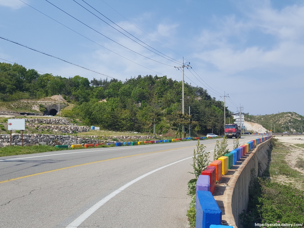 아야진 해변처럼 가진항으로 가는 도로변 경계석에도 빨주노초파남보 색으로 칠해 놓았다. 이번 여정의 종점인 가진항이 눈에 들어오기 시작한다. 이제는 어떻게 하면 집으로 빨리 돌아갈 것인가에 대한 생각으로 복잡하다.